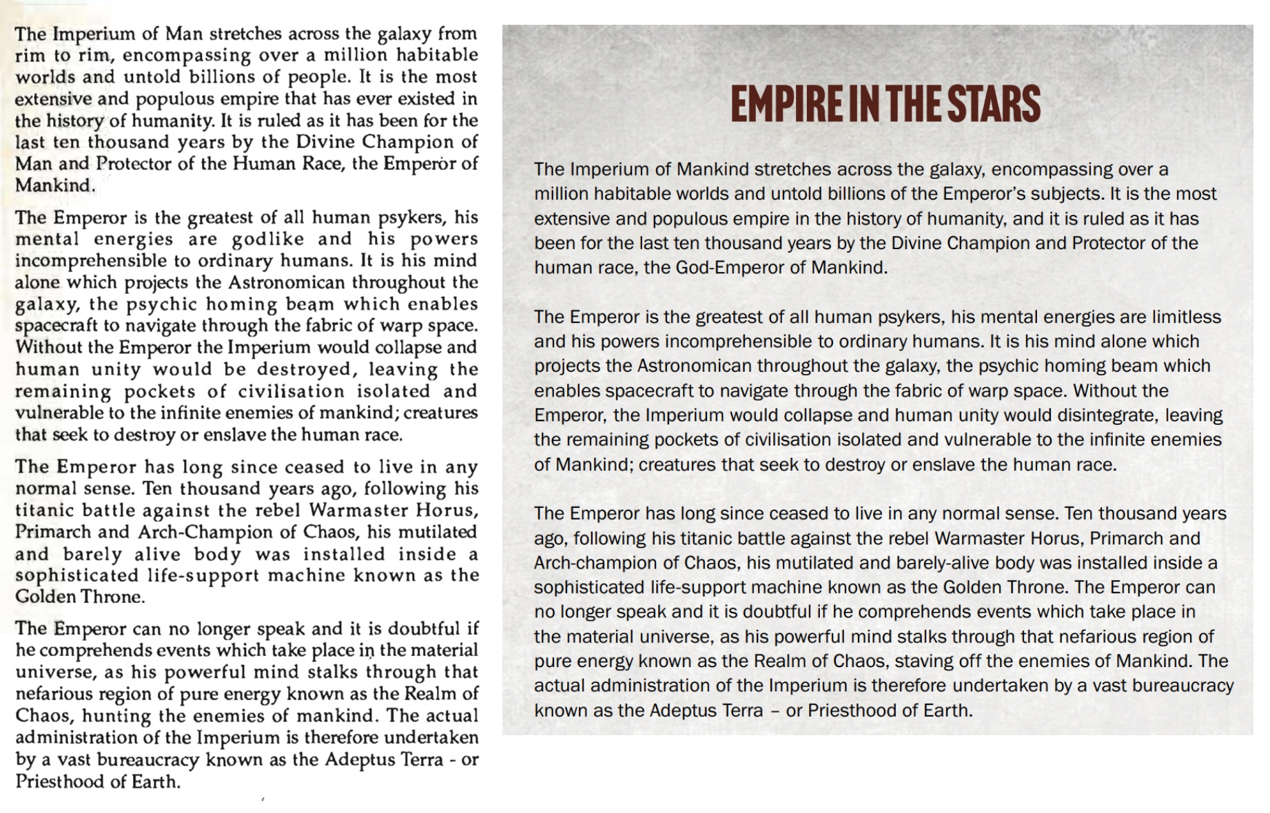 >>1120368 Так, может, не надо было играть космооперу? Зачем вообще было превращать сеттинг в книжную серию? Разве игроки не могут выставить армию на стол без оглядки на макулатуру?
