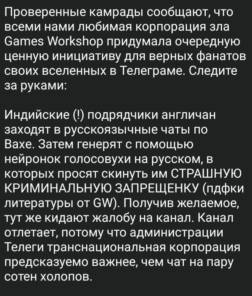 >>1119738 Вот кому не похуй на какие то каналы в телеге. Пусть хоть все перебанят, и двач заодно. Что то ГВ походу реально нечем заняться, все кодексы перевыпустили, все правила сбалансировали, все миньки обновили.