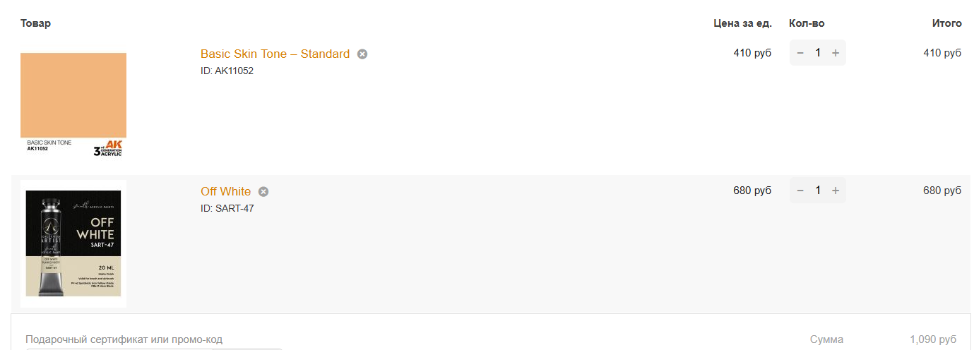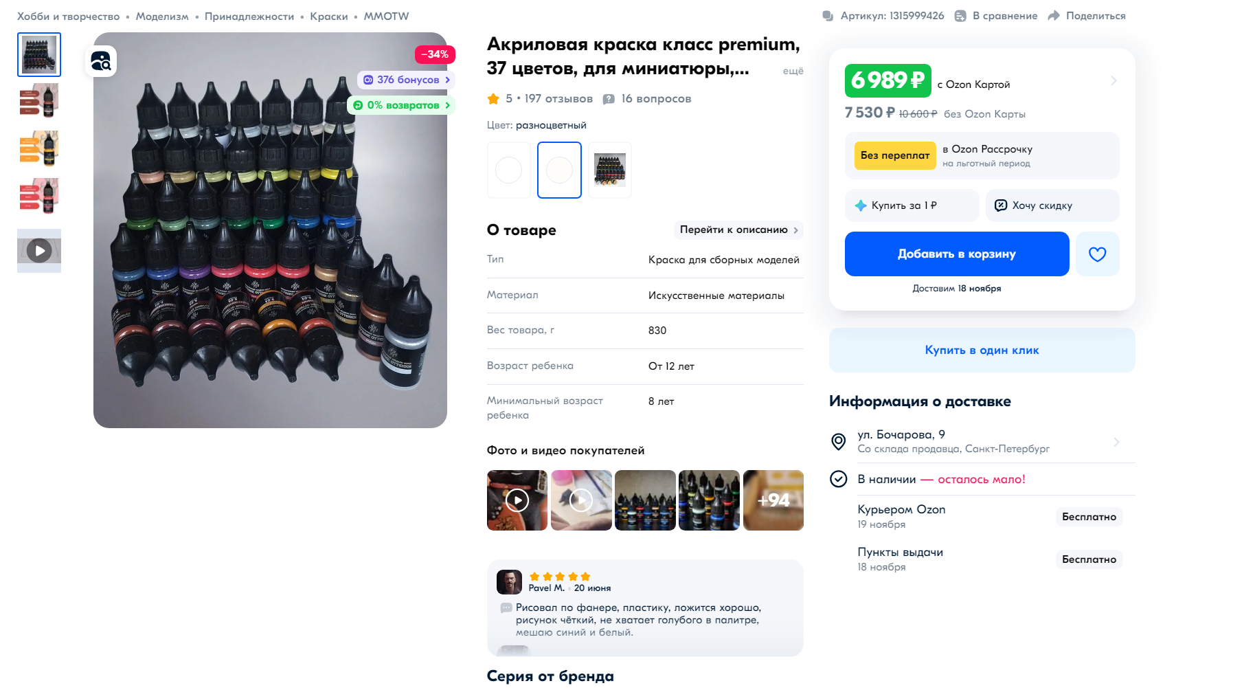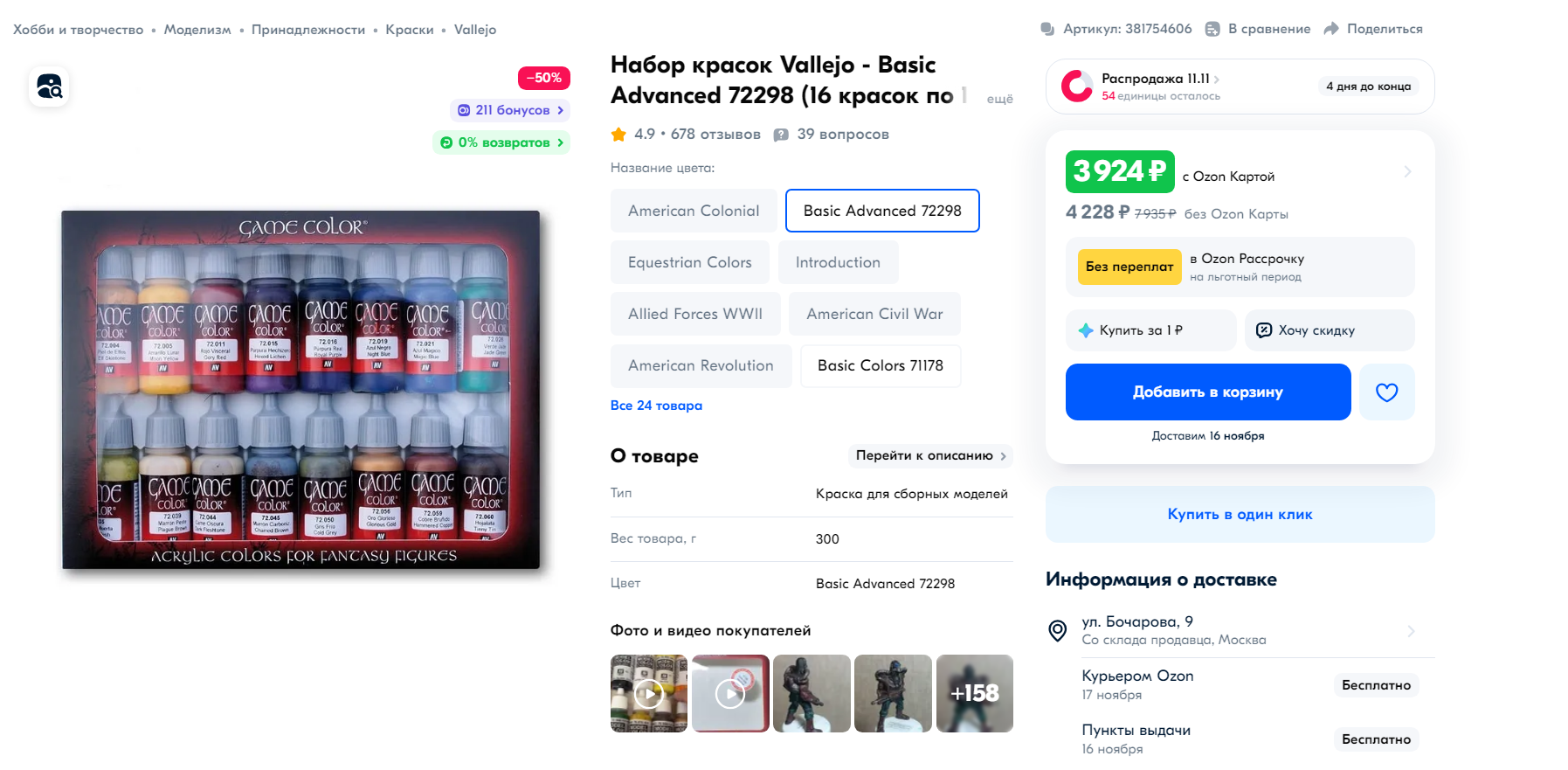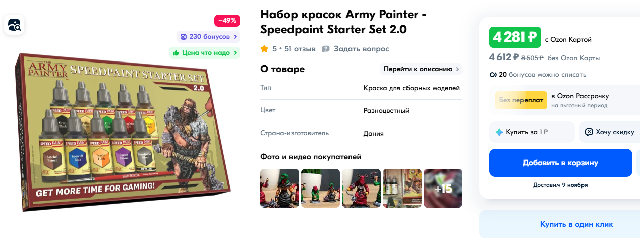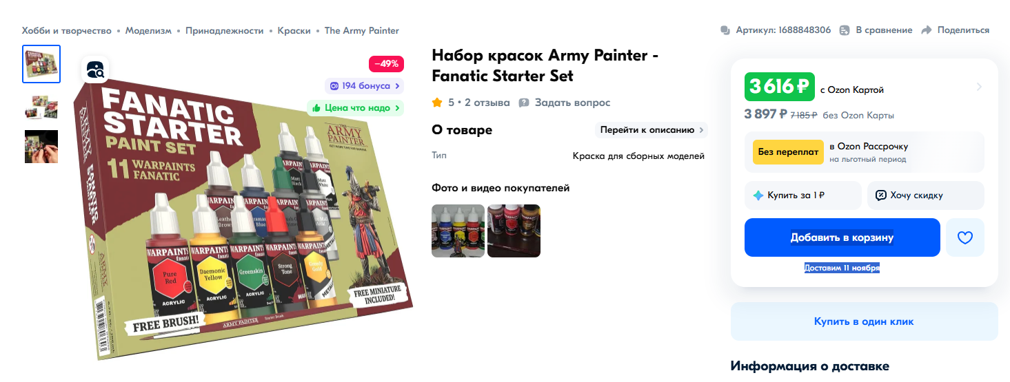Ещё можешь на ВБ посмотреть, там баночки Валлехо, если по одной брать, обойдутся в 350р, зато свежие. Можно также глянуть на СРМ, там кабанычи 290 за банку берут, правда брать надо сразу много, чтобы отбить доставку.