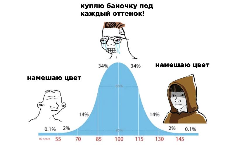>Выглядит будто хуйни набрал Не, я в своё время мечтал купить ультимативный набор, которым можно будет покрасить что угодно, применяя замешивание цветов. Но потом отошёл от этой идеи, так что тут абсолютно каждая банка долго и тщательно подобрана под конкретную задачу/поверхность/элемент.