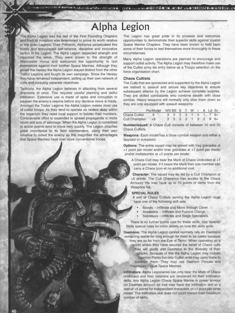 >>1120804 В конце Ереси Хоруса M31, на флагмане Детей Императора материализовался Слаанеш, в миру властелин удовольствий, могущественный демон Варпа. Его задача заключалась в том, чтобы на месте согласовать объем хаотической трансформации легиона Детей Императора со стороны сил Хаоса (неделимую часть Хаоса в Материуме представляла Шулаша).