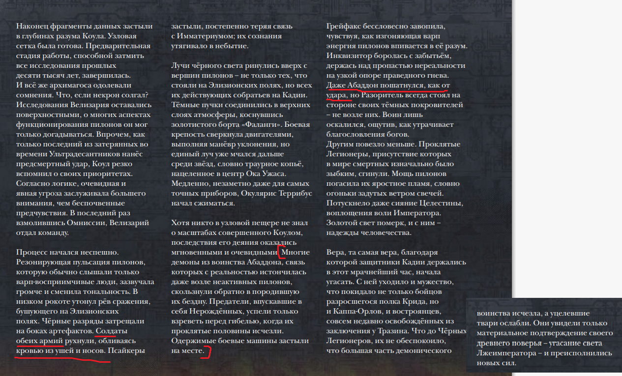 >И берет КОРОЧЕ ГОРСТЬ С ТЕРРУШКИ СВЯЩЕННОЙ-ТО И НАЧИНАЕТ НЮХАТЬ ЕЕ, А ПОТОМ ЛИЦО ОБМАЗЫВАТЬ СО СЛОВАМИ "ЗЕМЛЯ-ТО ТЕРРАНСКАЯ, ТЕРРАНСКАЯ, АЗЕК", А ТАМ УЖЕ АЗЕК ФАБИЯ ЗОВЕТ, А ТОТ НЕЗАМЕТНО ГАЛОПЕРИДОЛ КОЛОТЬ СКВОЗЬ ДОСПЕХ НАЧИНАЕТ АБАДДОНУ, А АБДДОН ПЛАЧЕТ, ВСЕ ПЛОХО, ЗА ЧТО ВОЮЕМ-ТО, ЛУЧШЕ БЫ КАК В СТАРЫЕ ВРЕМЕНА, ЭХ БЛЯДЬ ЛОРГАР ЕБ ТВОЮ ПИДОР