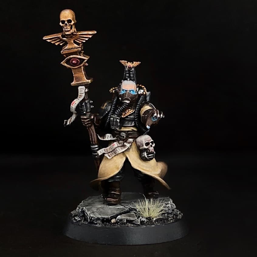 >Темные Механикус Он еретех, а не даркмех. На охаосевшего еретеха он не похож - слишком чистенький. Чёрно-красные цвета напоминают цвета Стигии-8, которая кишит еретехами-ксенаритами. Которые как раз лояльные, просто с ксенотехом играть любят. Или может он кто-то типа мойрианца: поклоняюсь Омниссии, который Император, но поклоняюсь неправильно, за это и выгнали.