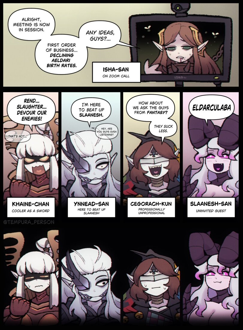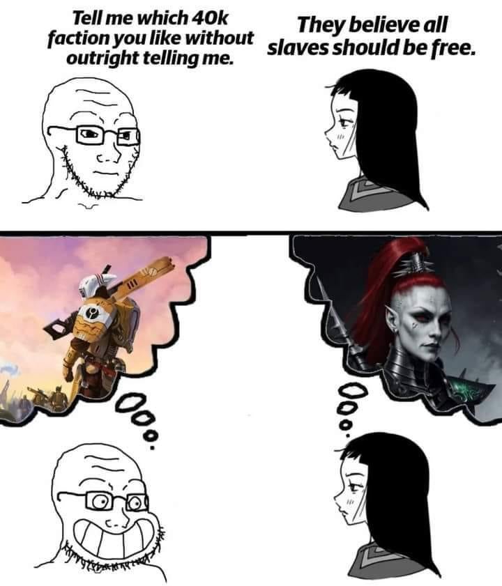 >>1127448 > а потом вот вам орки у которых пси мощь от Ваагха и вообще всю варп хуйню и хаос они вертят на пушке Гарганта. Орковская хуйня это тоже варп > То вообще каких то жуков которые псайкеры но с нуль полями и феноменом мертвого варпа, вроде с душами, но эти души не души, а хуйня какая то. У них не поля парий, а наоборот ультрапсайкерство которое глушит все вокруг. Император то же самое с демонами делал. Души-недуши и люди создают, чекай клонов примархов. > То демоны есть типо у хаоса, но есть черные тени и химеры у друкари, то статуя демон, то инкарна Бога трапа не хаос Тебе сколько раз персонажи из примерно всех фракций и рас говорили что демоны это "демоны" только для тупого быдла, а для нормальных людей это просто очередные ксеносы из параллельной реальности? Они даже не единственные и не самые страшные из варп хуил, но всех остальных за ксеносов считают. > то горящие космодесатники демоны императора, то баба ангел. Эльдарские души помнят прошлые жизни. Император по сути похожий принцип использовал и собирает души воинов чтобы суммонить когда надо.