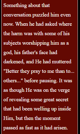 >>1127732 I was born the sixth son of Kaschada, hetman of the Tabor on the day that the Great Prophet came among us. The Tabor were the outcasts of the world, condemned because we were faithful to the Gods of the Four Winds: the Blood Wind that fired the warrior’s soul, the Plague Wind that purged the weak, the Wind of Change that brought the gifts of the Gods to men and the Scented Wind that roused the passions.