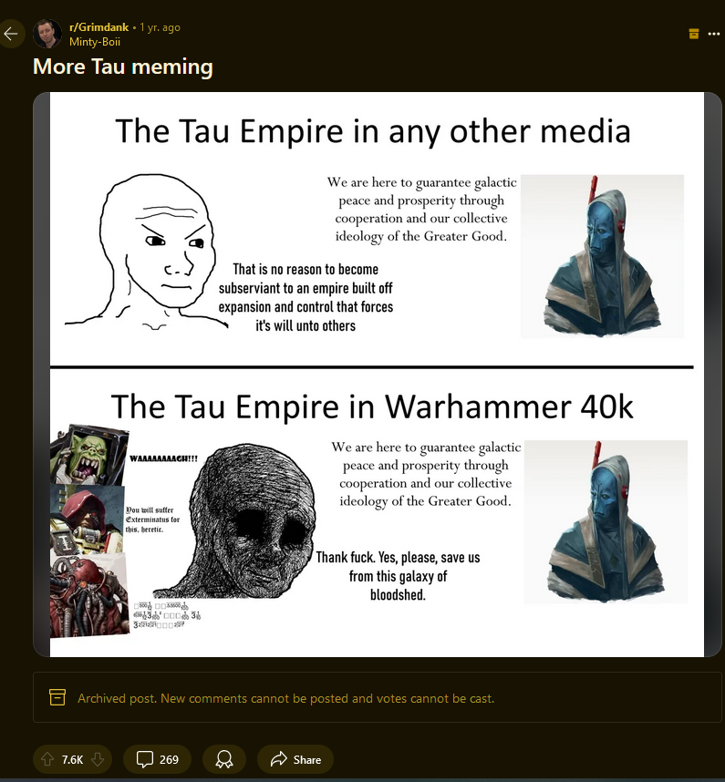 >>1127514 > так зафорсился, что про него каждый неофит знает, он никогда не станет играбельной фракцией. Потому что это маленькая местечковая армия в жопе галактики, хоть и с любопытной идеей Прям тау описал