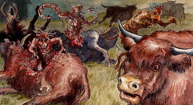 Instead of raising the banner to signal another charge he pointed to the crest of the hill at his back as the moon rose behind it. Over the ridge came daemons with blood-soaked skin bearing huge axes and swords. They rushed at the Storm Giants and we followed. The Warriors of the Gods clashed and normal men were hurled about by the power they unleashed. I staggered into the press clutching a broken lance. Flaming winds cast me down but I pressed on and thrust my lance into the first of the Storm Giants I could reach. I struck him where his armour was twisted and melted. He fell and as he did the Prophet leapt upon him and with glowing blade cut him open and pulled the organs from his body. He held his bloody prizes aloft and told me that immortality beckoned me.