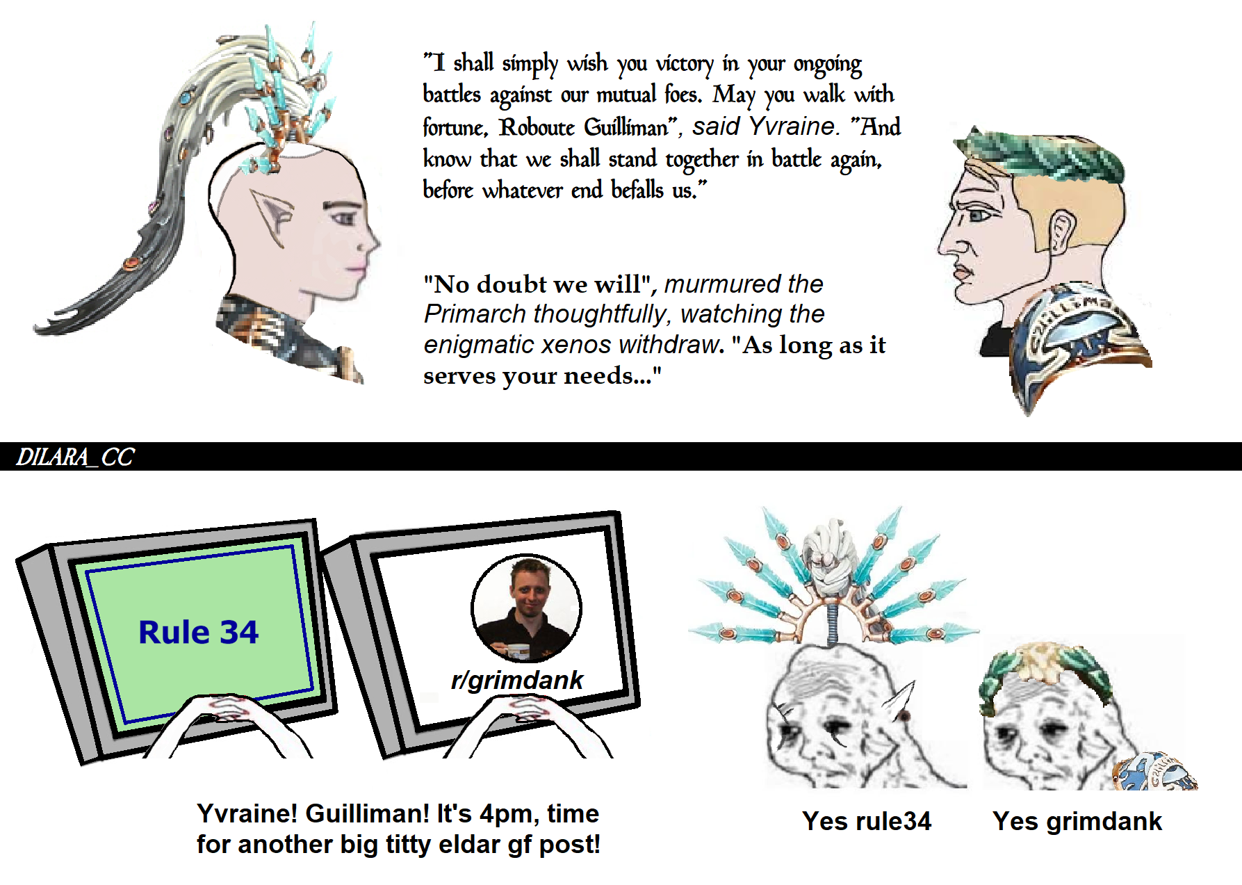 >>1128705 >Вообще интересная идея что эльдары в животе Слаанеш раскрывают свою природу и им это становится в кайф Вполне возможно, эльдары - любимые поклонники Слаанеш, она их держит поближе к себе и даёт им самое лучшее - самих себя без всякой прикрытости, и 2% говна знают об этом, стремясь уйти в отрицание. Но из-за того, что сладкоежка перешла на сахарозаменители, низшие рясы считают Слаанеш мужиком, а средняя демонетка выглядит как уродство. Жаль, что демоны хаоса скатились до подсосов смов, но с шипами.