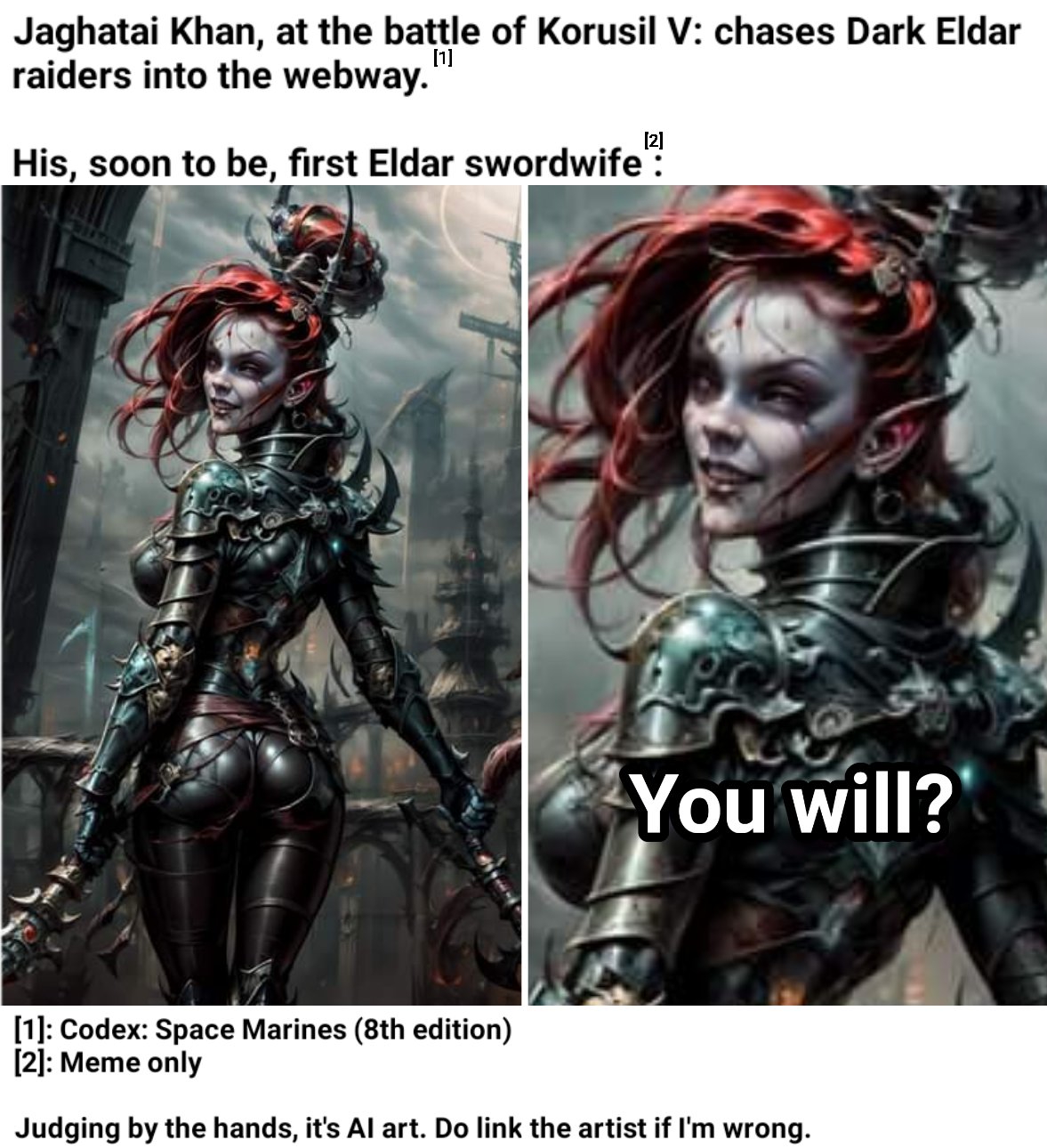 >>1133567 Буквально, сюжет эльдарской линии " Богов Марса" - снести планету безумного магоса Телока, уничтожить десятки кораблей экспедиции с тысячами мон-кеев на борту каждый, вырезать крейсер Черных Храмовников, уничтожить бесценное наследие Темной Эры Технологии - и все это ради того, чтобы... Забеременеть девочкой-пусечкой. Сперанца, мизогинистические Храмовники и магос- хуеносец ломали линии вероятности и не давали главной героине забеременеть! Спойлер:Так и не родила. Во всем виноваты мерзкие мужские мегамужики. Осуждаем экспедиции Империума на край галактики, всем Твичом осуждаем!