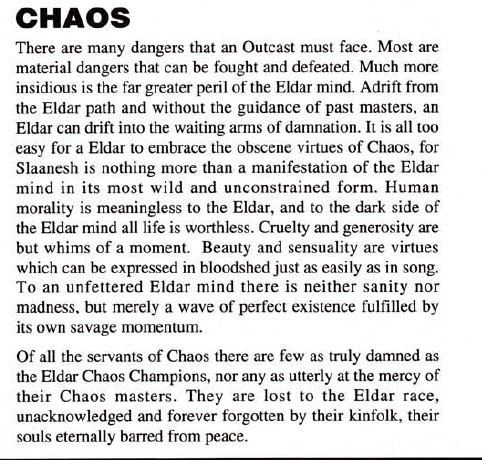 >>1131887 Слаанеш изначально про секс, наркоту и рок-н-ролл, даже в её имени. По крайней мере, так говорил Анселл про то, как придумывали богов хаоса. >Slaanesh was meant to be a sibilant, erotic, breathy, whispered/murmured sound. The models didn't turn out quite as erotically charged as I'd hoped. Про хорошо покушать это уже нюлор и соефикация, потому что надо продавать детишкам и пуританским островным/заокеанским пидорашкам.