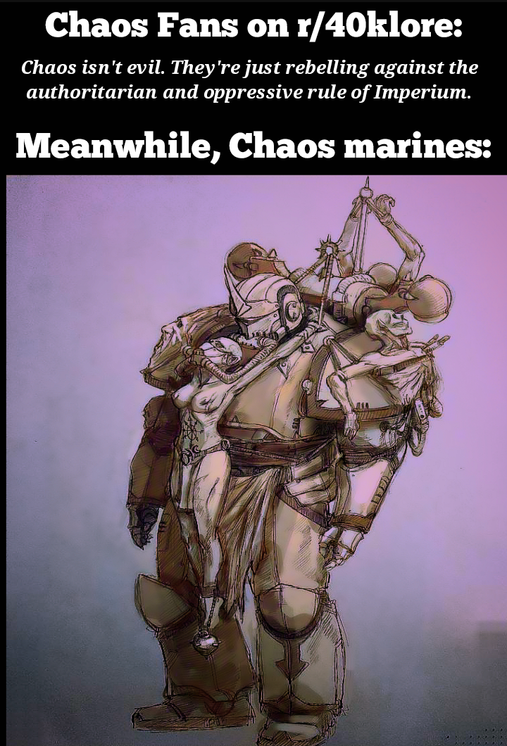 >>1131638 Меня смущает именно что для Империума по определению все ксеносы должны быть подвергнуты геноциду, получается что даже условные нурглиты для каких-то рас будут лучше, потому что они предлагают какую-то но форму жизни, не говоря уже про предложения тех же Тау или возможно Эльдар, которые очевидно допускают существования низших рас если они им не мешают.