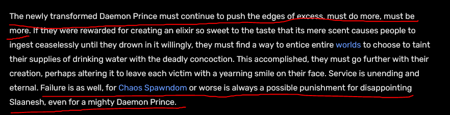 >>1159048 Я с трудом себе представляю демоничество, как концепцию. На уровне совокотьего (а не настолочного) вольника, ты вообще все свои потребности закрываешь деньгами. С ручным божеством, ты можешь все еще оставаться человеком, но исполнять самые безумные желания и причуды. Типа там электричку до Терры пустить, подулей отмыть, сервиторов запретить. Ну а вот стал ты князем демонов и? Человеческих потребностей не осталось вообще, всю вечность бултыхаешься в варпе, пока божество- покровитель не кинет в очередной раз гасить людишек с предсказуемым итогом. Или вечно поливаешь говном грядки в саду у Нургла? Херня какая-то.