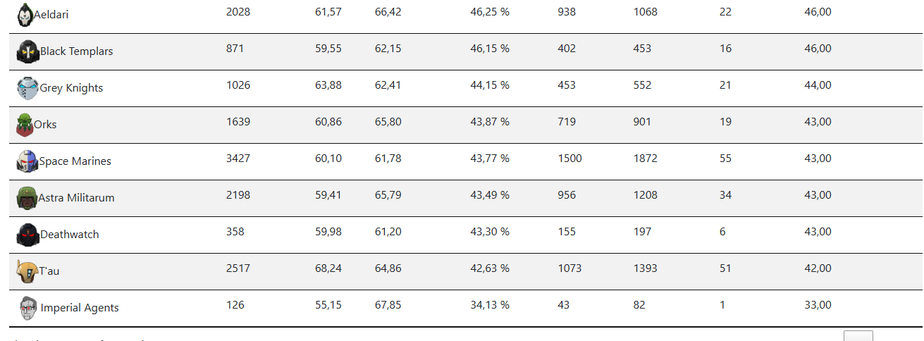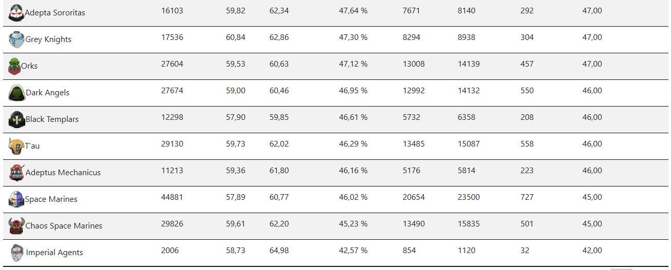>>1138482 Например, выставляешь актуальный набор миссий и сортируешь по проценту побед. Тау на самом дне, не считая недофракцию, за которую никто не играет. По Парии нексус тоже на дне барахтаемся. СМ, ХСМ - самые ванильные фракции с большим количеством хомяков, потому рейтинг пониженный + у игрочков за них всегда есть возможность играть другим кодексом.
