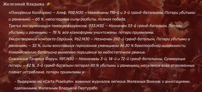 >>1140031 >были ли предатели среди человеколюбивых саламандр Да, было и такое >Обратившиеся на службу магистру войны Саламандры, которые покинули своего прежнего господина, стремятся испепелить узы, что когда-то связывали их с Императором, во всепожирающем пламени. На поле битвы их рвение к службе новому хозяину становится очевидным в следе из пепла и разрушений, остающемся после них. >ультрамаринов >Несмотря на успехи в воинском ремесле и громадное королевство, которое они построили для далёкого Императора, некоторые из Ультрадесантников никогда не чувствовали, что удостоились похвалы, достойной своих достижений. Хотя практически никто в легионе не одобрял разрыва со своим почитаемым примархом, нашлись некоторые, кто счёл, будто бы легион сможет занять более подходящее положение в любом новом Империуме – и что хаос Ереси Гора являет собой шанс для легиона установить своё господство и продемонстрировать всей Галактике истинный характер Ультрадесантников. >[1] Тем не менее, единственный должным образом прописанный момент с предательством внутри Тринадцатого в годы Ереси Гора описывается в статье «Битва за Калт: Война в подземном мире / The Battle of Calth: Underworld War». Краткое упоминание предательских Ультрадесантников также содержится в книге «Теневые войны: Битва за Бету Гармона» («искажённые или испорченные обрушившиеся на них пагубной энергией») – отмечено, что они сражались против собственных собратьев и впоследствии бежали вместе с отступающими силами Несущих Слово, продолжая наносить удары по владениям лоялистов на протяжении всей Ереси Гора, однако их имена, подразделения и подробные обстоятельства измены всё же остаются неизвестными.