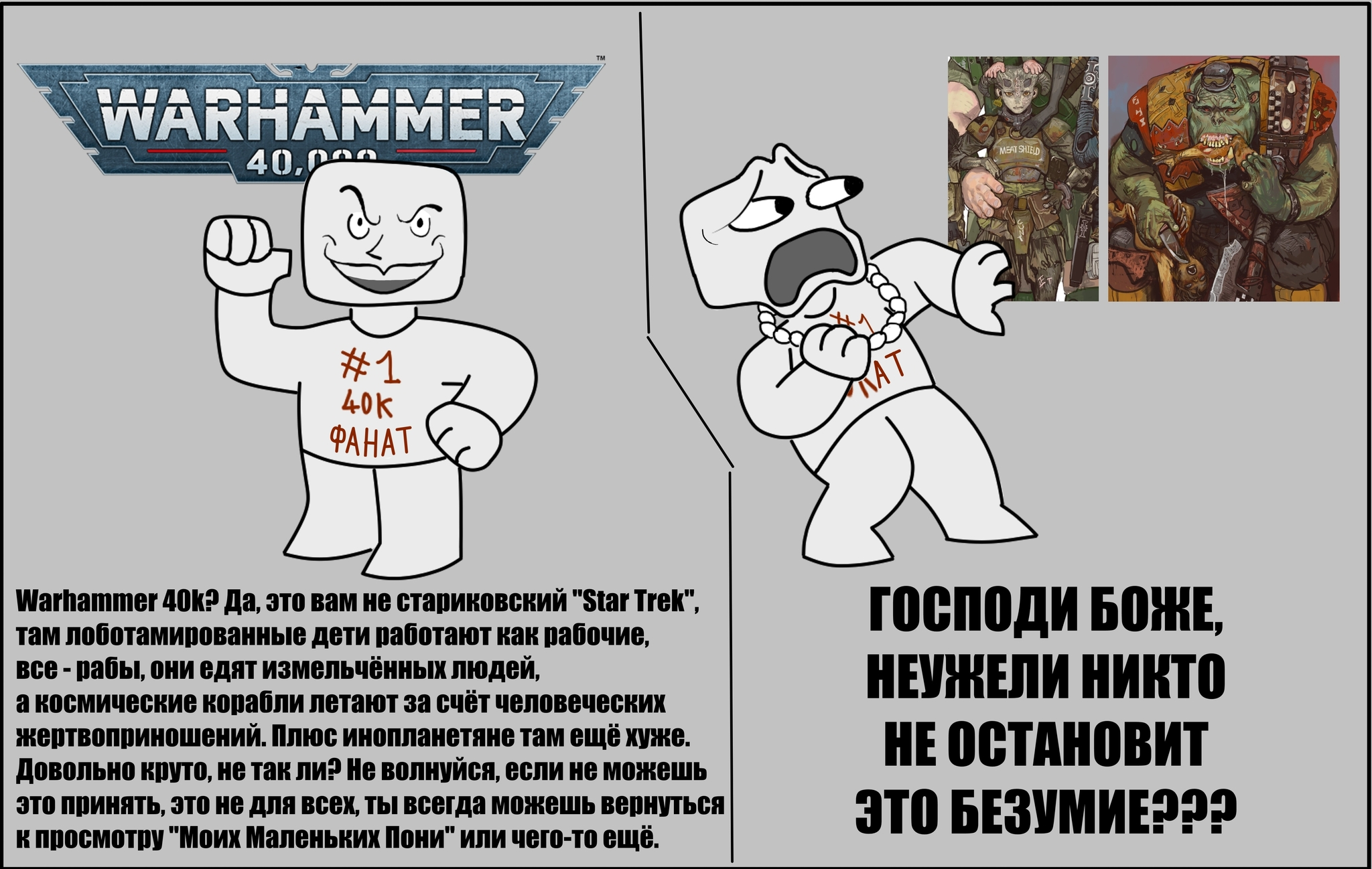 >>1138385 >Параллели должны по идее пугать Та нi. Межзвездный Империум не находится в вакууме. Да, псайкеров жалко. Но вот губернатор решил оставить одного на домашнем обучении - и хана всему вокруг. А залетные хаоситы с псайкер-прайдом пообщались - и вообще чуть в варп планету не утянуло. Ксеносы? Не друзья, у них свои заботы. За брехней про Всеобщее Благоденствие - ферромоновый ГУЛАГ. Самые вменяемые союзники - орки, зашибись. Уровень потребления? 333 войны прокатилось, а у них - "мясо грокса жесткое". Управление какое-то не такое? Связь системы "полудохлому Васе приснился готовый к извержению уд и два ежика". Планета шлет провода, жрат и солдат чтобы генокрады две других не схарчили - и хорошо. Церквей много? Без них молиться все равно придется. Собирая черепа, и Кхорну все равно чей череп... а Трейтор Максимус Прайм Ерохин все равно тебя круче. И т.д., и т.п. Империум - это когда живущие на подачки древнего Барена Всего Говна уже десять тысяч лет каждый день спамят "завтра рассыпется, Император кашляет, циклонок на два залпа осталось, стыдно быть".
