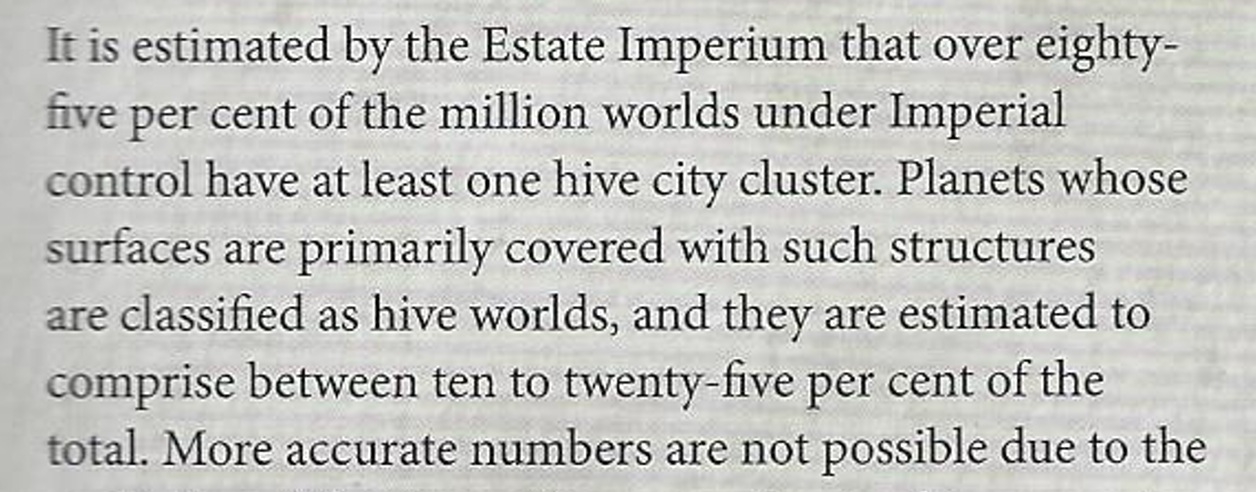 Еще говорят в империуме есть такая залупа как hive sprawl - плотная квадратно-гнездовая застройка а-ля хайв, только вытянутая не в гору классического хайва, а размазанная вширь и сравнительно невысокая. Смутно припоминаю что в боротьбе за Нахмундовку показывали планетарную карту с территориями контролируемыми разными фракциями, и там эти справлы были большими такими пятнами, примерно как континенты на Земле или на океаническом мире с меньшим процентом суши.