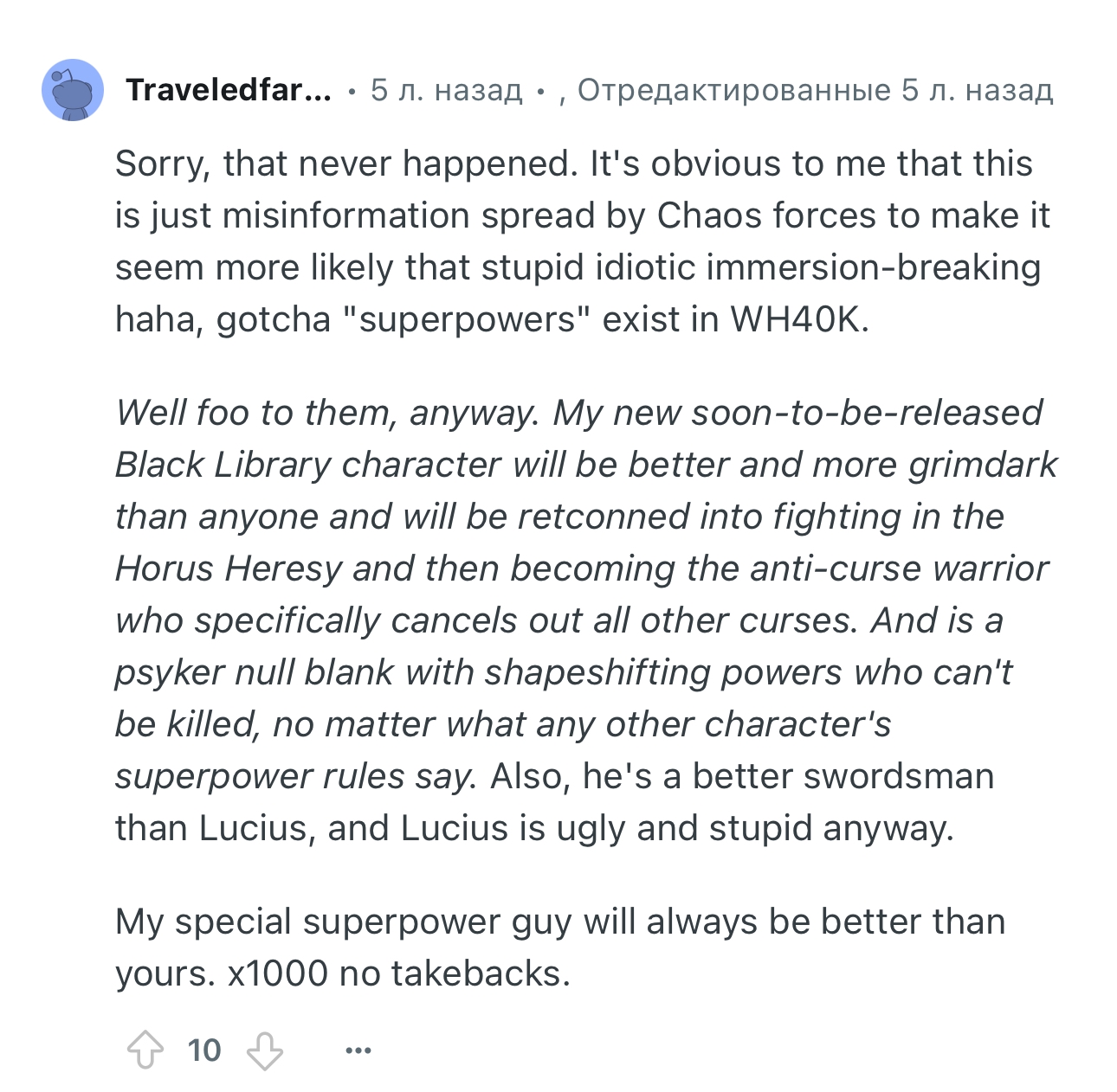 >>1147169 Ну вообще там вариантов то немного: 1. Братья послали импи нахуй ещё до того, как тот присел на золотой сральник. Это было стратегической ошибкой, и батя при помощи своей ручной псины ПОКОРАЛ. А ведь немного попозже буквально все положили хуй на приказы с Терры, даже небо, даже Жиллиман, и никому ничего не было за это. 2. Два легиона просто самоубились об Рангду, а чтобы не демотивировать остальных, Импи выпилил их из реальности в лучших традициях 1984, недаром он старинной литературой увлекался. И самих примархов тоже выпилил, руками Срусса. 3. У них были какие-то настолько стрёмные отклонения, что армянин решил свернуть проект этих двух легионов. Примархи взбугуртнули, дальше понятно: ав гав гав я ПОЛАЧ ИМПЕРАТОРА. 4. Их так и не нашли, имперян распихал два легиона к кулакам и ультрамаринам, а чтоб не поднимать неудобную тему про ненайденных братьев, придумал тему со стиранием памяти. 5. Малал.
