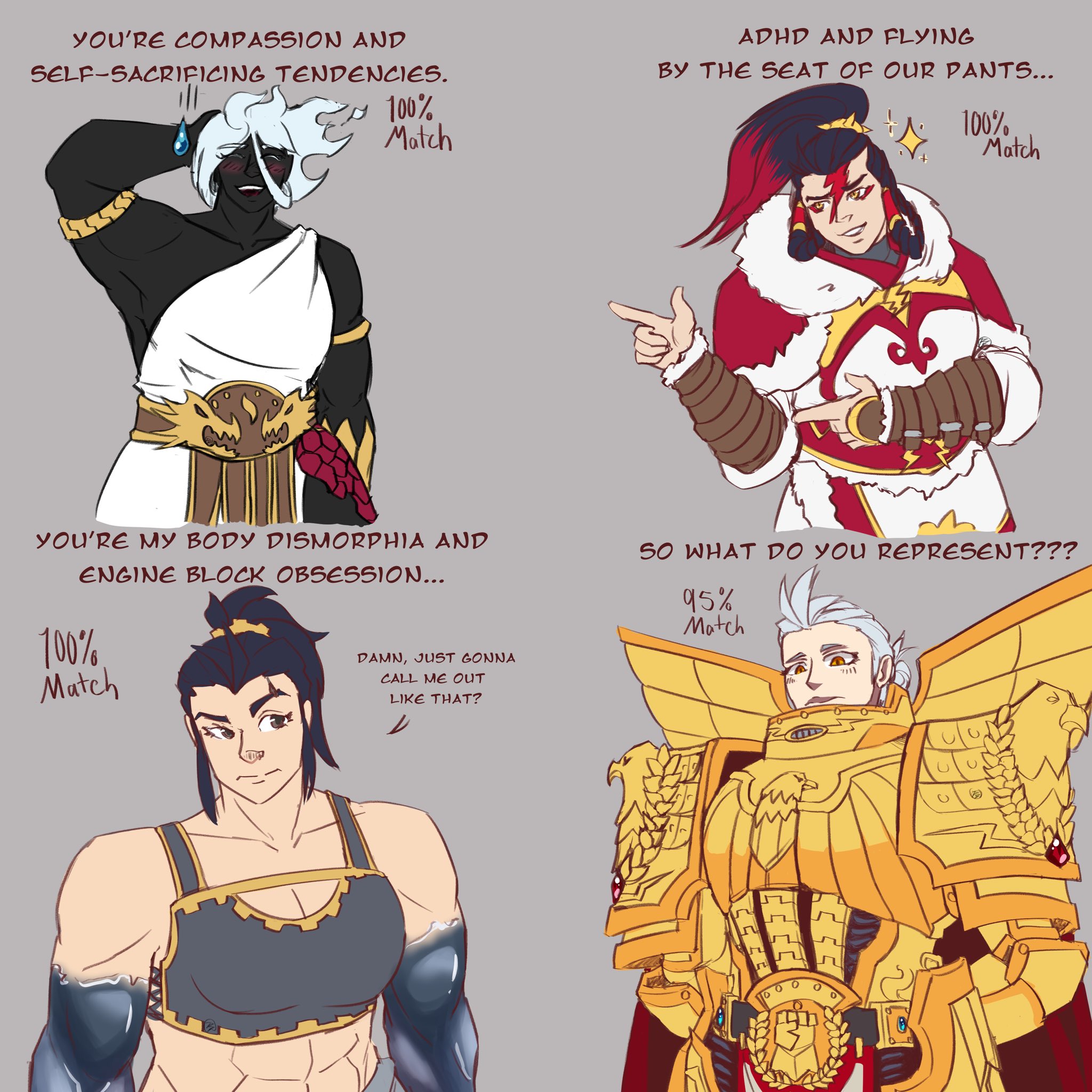 >>1147336 >Ещё один вариант - они послали импераху нахуй и начали строить свою собственную империю в союзе с ксеносами, и качество жизни там было лучше чем в тронолопатии. Еще один вариант, что это Супер Примархи - коллективный Примарх Лоялист и коллективный Примарх Еретик, которые борятся по команде Императора, для достижения ему одному видимых целей (напоминаю что в Галактике сейчас гигантский разлом и варп прорывается нахуй, расширяясь). И они собираются из 9 обычных примархов, в одного такого Мегатрона, и начинают пиздится в ХТХ с Титанами там, прыгать с планеты на планету, и всякие такие классные темы выделывать. Надо только определить за какую часть тела отвечает каждый примарх, и в костюмах каких цветов они будут ходить.