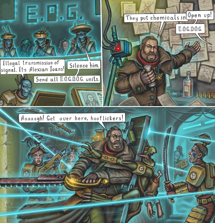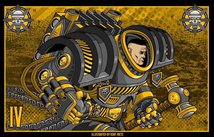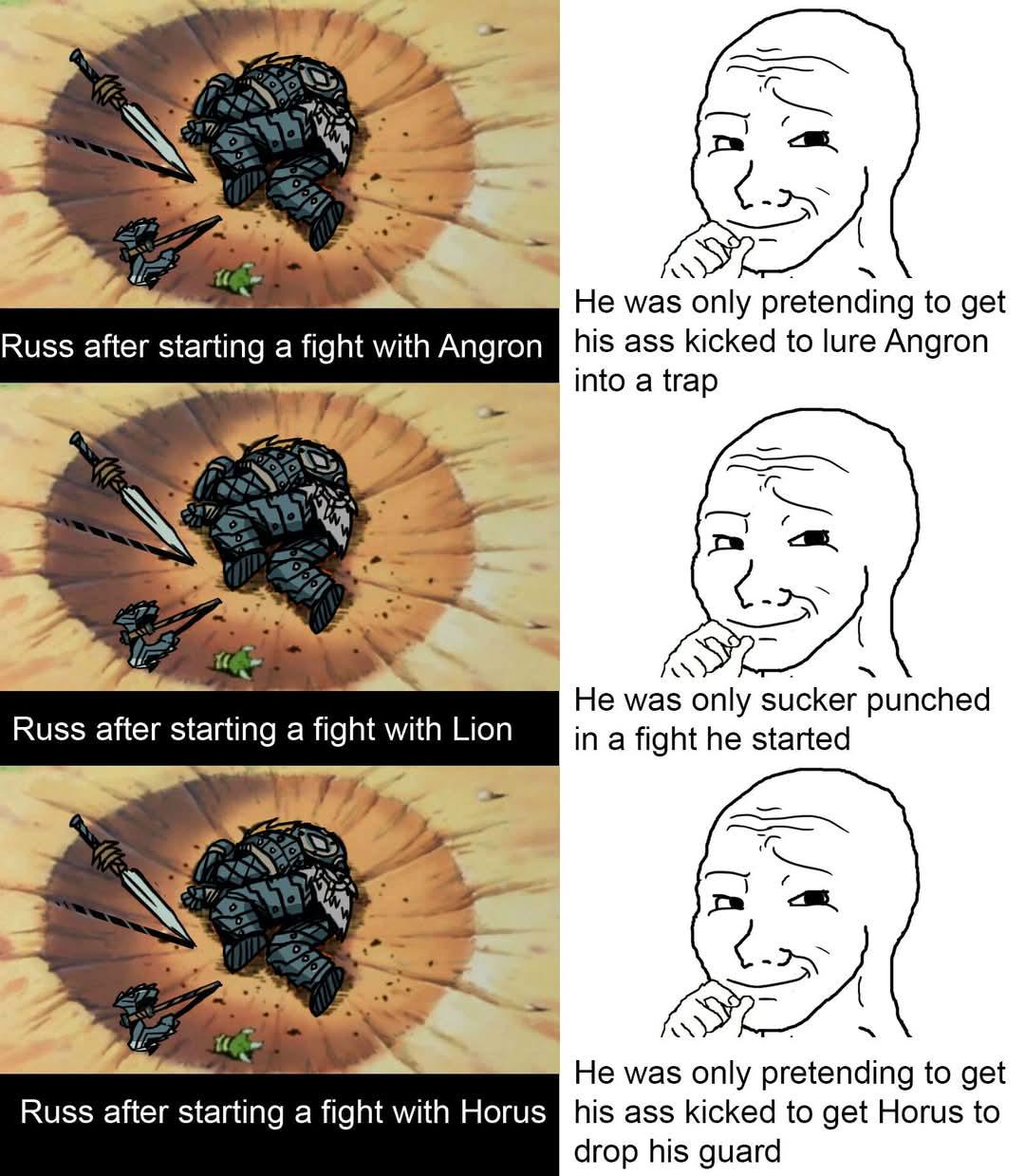 Теория под амасеком. Следующими примархами для возвращения будут аж целых два: Вулкан и Дорн. Л — логика. Вашштор собирает всё что нужно и становится богом хаоса. Естественно ему нужен представитель в реальном мире, а для этого как нельзя лучше подходит Пертурабо. Пертыч официально получает звание демон-принца и организовывает свой собственный поход в Империум. Лев и Жилиман не могут состязаться в тактике с математическим складом ума Мастера осад и потихоньку ему сливают. Грядёт катастрофа. В это время саламандры увлечённо собирая реликты Вулкана, находят их все и, до кучи, в какой-то варп-дыре, стазисе, ещё хер-пойми в чём — Дорна. Тащат это всё добро на Терру, там же, вроде, Вулкан тусит и ему всё это дело сбагривают, мол «Батя, твой выход!» Дорн приходит в себя, но без руки не может противостоять Пертурабо. Тогда Вулкан берёт все свои ёбы и перековывает их в новую броню для Дорна с охеревшим силовым кулаком. Которым Дорн в очередной раз сворачивает набок челюсть Пертурабо. Дорн герой с новой минькой. Вулкан герой с новой минькой и наковальней. Пертурабо снова лох, с новой минькой и соплями.