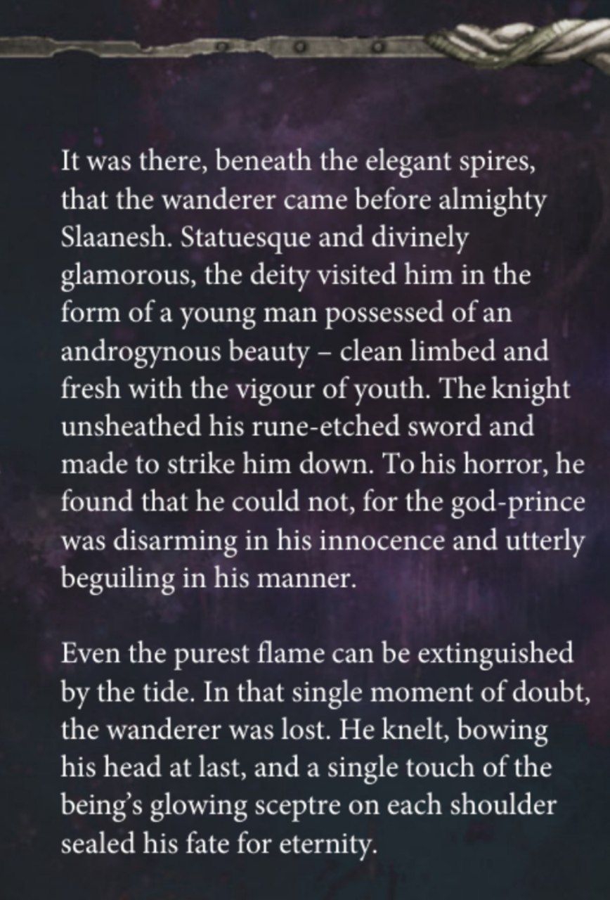 >>1150272 Это твоя личная интерпретация образа Слаанеш на основе древнючего лора. А актуальными лицами слаанешитов в АоСе являются гипернарцисс и обжора-каннибал, а на подтанцовке всякие любители дурманов и красивых битв. А в 40к и того скучнее: червь-пидор, Люций и любители громкой музыки. Ни насильников, ни трапов, ничего подобного.