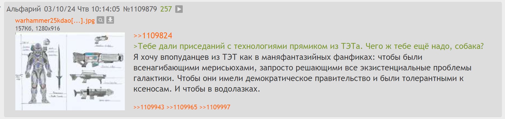 >Но не унылая лига вотана с унылыми дворфами. >Например с идеальными технологией менять днк, которую они модифицировали веками. Ну так это и есть вотаны - меняли днк, дотрахались до мышей доменяли днк до дворфов. А что унылые - ГВ тебе сделало осколок ТЭТ в лице скватов, не нравится - твои проблемы. Ещё одних ТЭТ-мерисьюх сеттинг всё равно не выдержит.