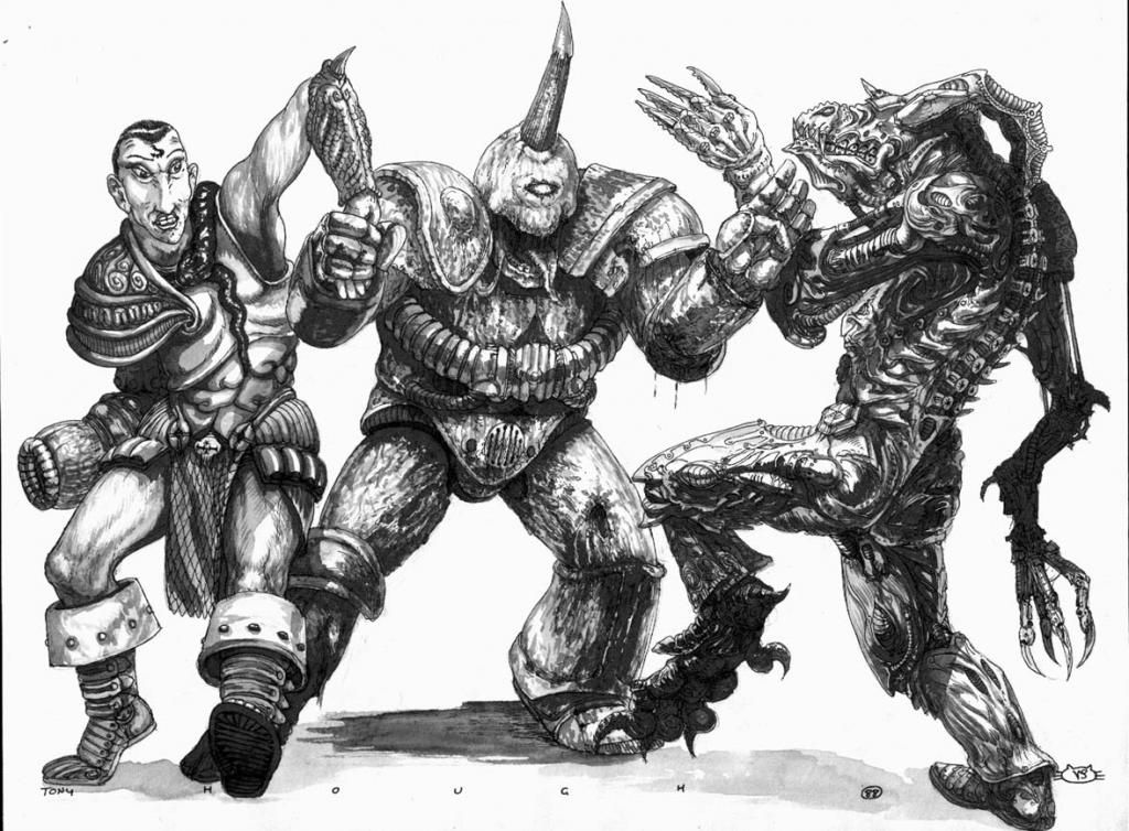 >Другим не нужно было сбрасывать доспехи. Порождения Хаоса материализовались: существа размером с волка, с паучьими ногами и телами бесов, с жадными щупальцами и фаллическими трубками. Сам Жак почти поверил, что ему мерещится. Змееподобная пуповина соединяла этих порождений с раздутыми паховыми щитками их хозяина, который стоял позади, рыча и ржа от восторга, направляя порождений в овладении пленниками, впитывая ощущения этих блуждающих внешних членов.