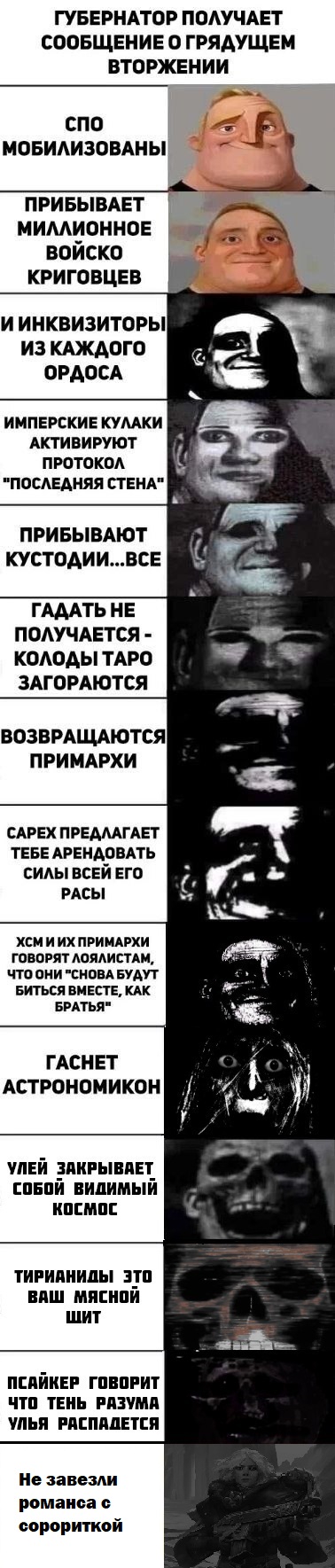 Дорогой неофит, если ты зашёл на эту доску и ищешь картинки в хайрезе или пдфки кодексов, то погоди создавать тред с реквестом, написанным КАПСБОЛДОМ, лучше спроси в треде картинок/литературы. Актуальные ссылки всегда висят в шапке раздела. Если ты не понимаешь каких-то вещей, у тебя есть вопросы, ты жаждешь знаний по бэку/настолке, то смело спрашивай тут, и мимопроходящие вахаёбы постараются ответить на него в меру своей упоротости/дивности. И не забывай о Лексикануме, он зачастую знает больше анона: http://www.lexicanum.com/ Для настольщиков: https://wahapedia.ru/