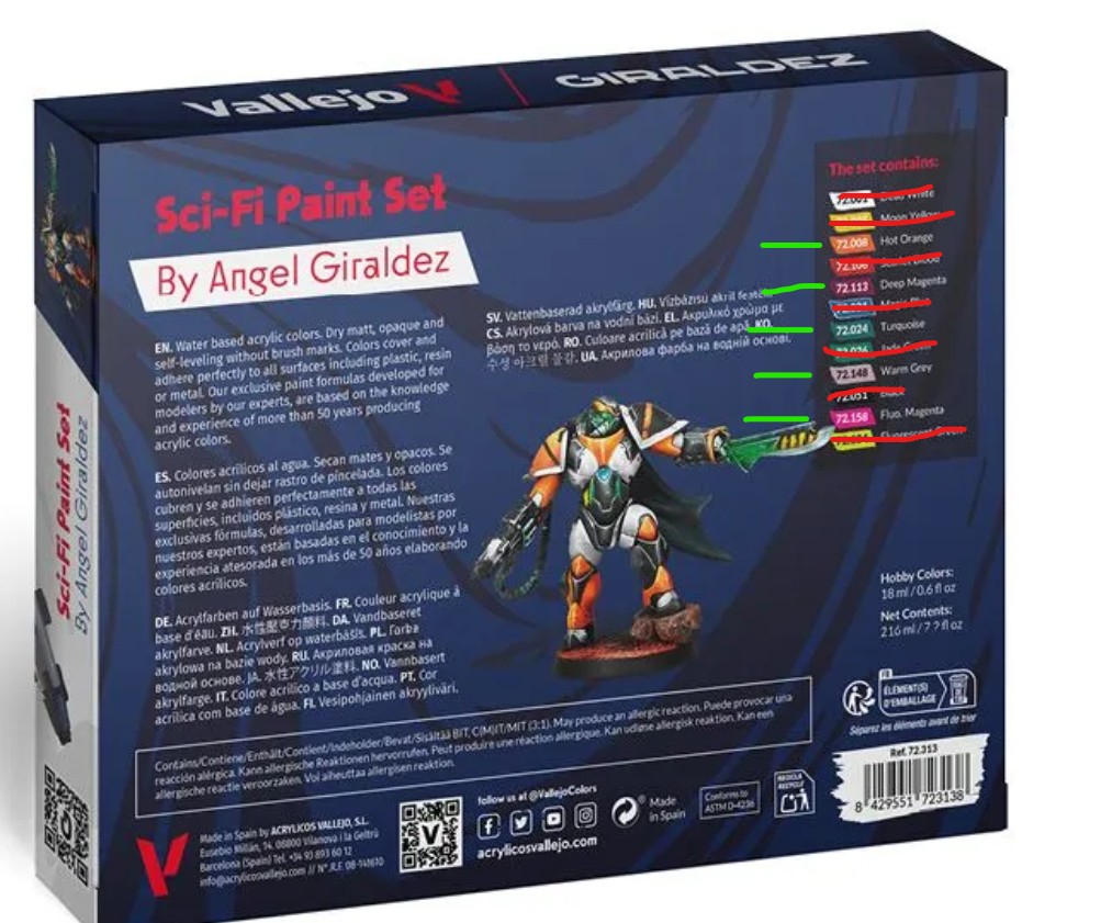 >>1150783 >Ultramarine Blue Magic Blue, он более яркий и насыщенный, и ближе к тому, что в видосе. Ультрамарин валехи идёт в пурпурный >Vallejo Dark Rubber Зачем? Что ты с ним делать будешь? Это тёмно-серый если что. Если нужен чёрный, то бери Black обычный. >agrax earthshade >Vallejo Game Colour Dead White 72.001 Норм. >Vallejo Gory Red Как и с ультрамарином слишком тёмный, только этот ещё темнее на уровне кирпичного. Бери Scarlet Blood или Bloody Red. Первый яркий и насыщенный, второй слегка бледноватый и розовый, но всё ещё красный. Не перепутай со Scarlet Red, он что твой Gory Red. >Gunmetal Vallejo Model Color VAL 70863 Это не металик если что, что обычная матовая цвета воронённой стали.