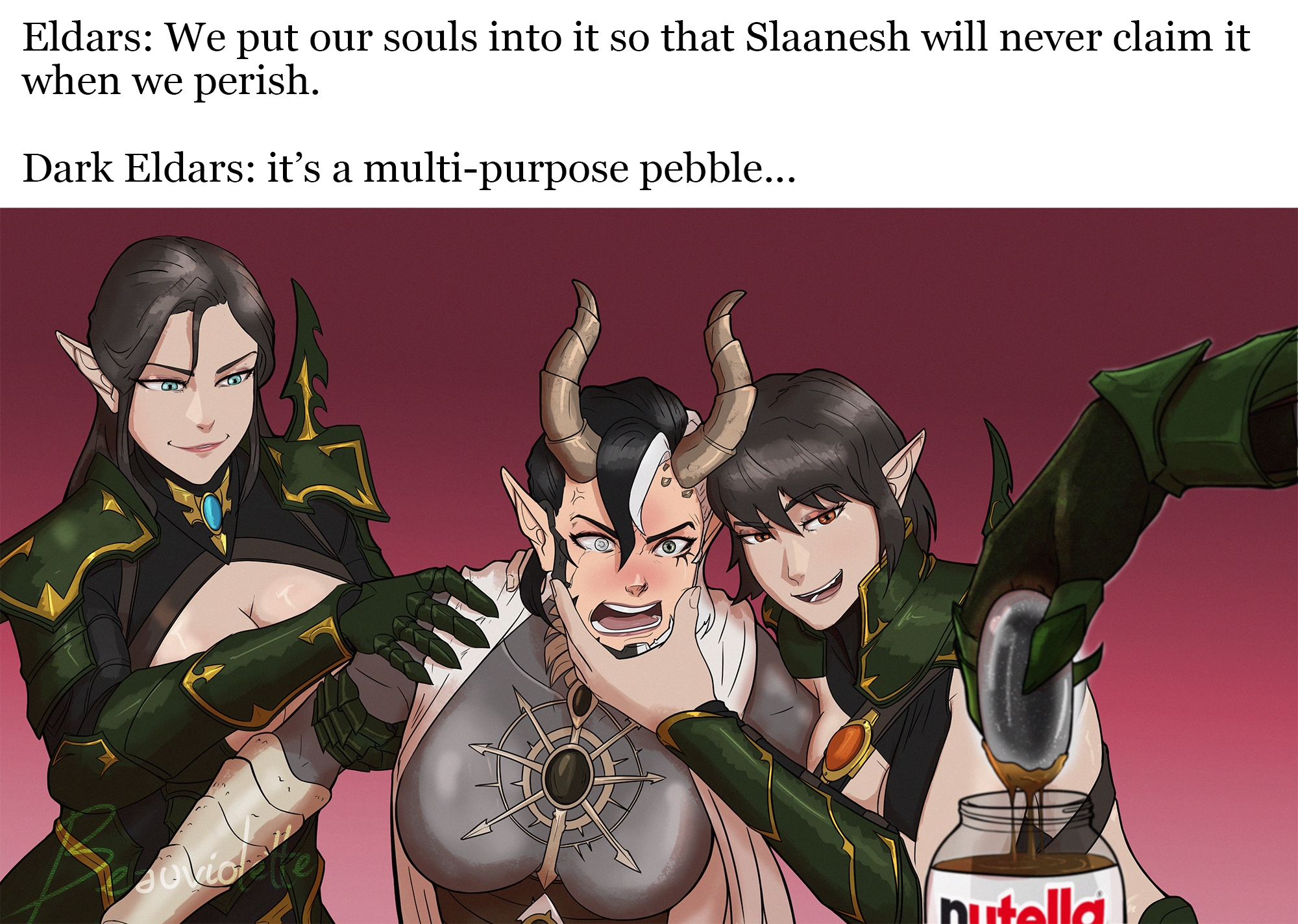 >>1152646 Замечали и даже видели демонеток и хранителей секретов. И обычно после этого начинали бесоёбить ещё больше под воздействием психического воздействия и феромонов. В одной из книг был момент, когда эльдарка проповедует молодой паре о том что грядет пиздец и нужно валить на миры-корабли, на что главный герой говорит им, что она поехавшая и можно расслабиться и получать удовольствие. В прошлом треде фрагмент кидали Вот сборник отрывков о жизни до падения и о том каково было жить под культами удовольствий https://www.reddit.com/r/40kLore/comments/s2y233/various_excerpts_the_fall_of_the_eldar/