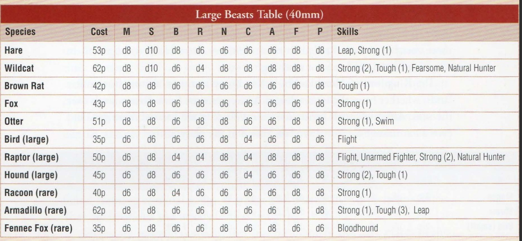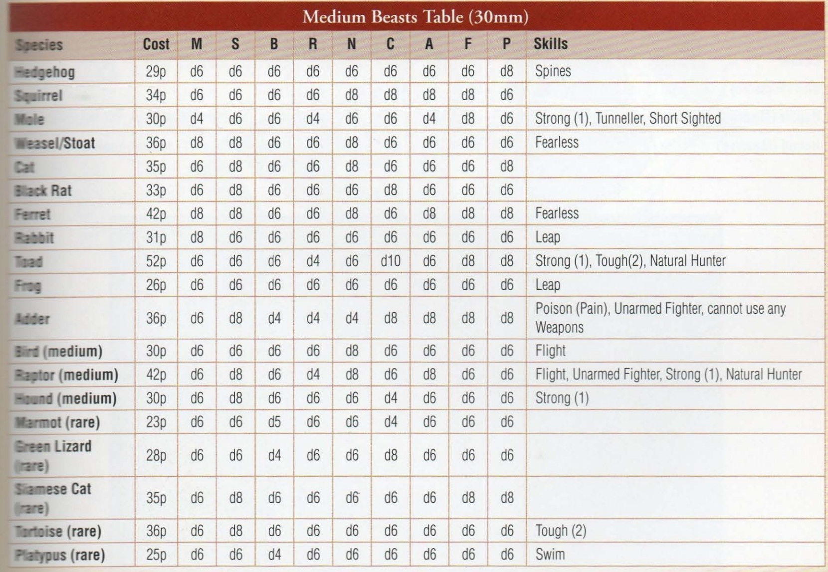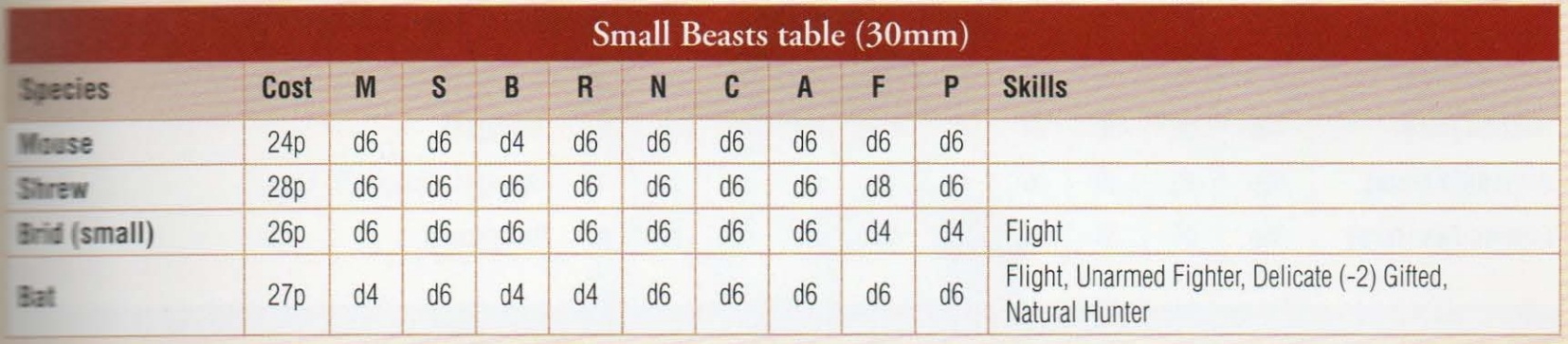 Нарративный скирмиш про антропоморфных зверят, которые задорно режут друг друга в разных уголках сказочного королевства Northymbra. Имеется кампания, где игроки собирают банды от трех до десяти рыл, основывают базу, которую можно достраивать в процессе игры, и устраивают движуху в песочнице, без цели и смысла. На столе геймплей, помимо стуканья, пуляния и колдовства, состоит из пряток и устраивания засад, запинывания толпой и ГЕРОИЧЕСКОГО САМОПОЖЕРТВОВАНИЯ.