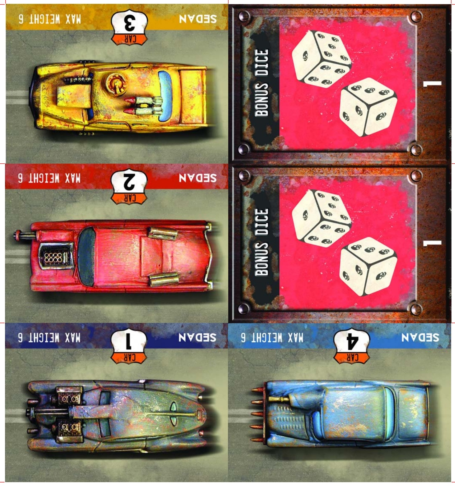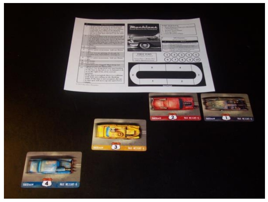 Другой особенностью является игромех: вместо того, чтоб возить машинки по столу как умственно отсталые, игроки отслеживают положение своих тарантасов на двух игровых поверхностях - шестизонном трэке и текущей зоне, где и размещаются карточки или модели.