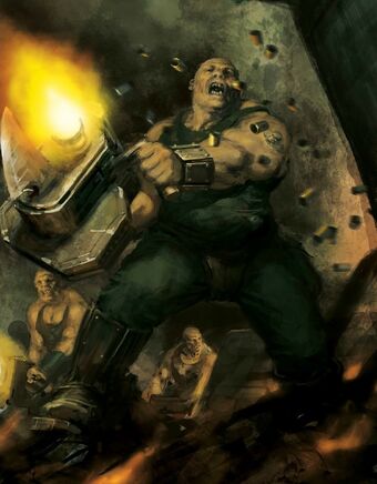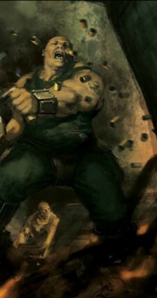 Грогул с яростным ревом начинает вести шквальный огонь по толпе врагов. Ливень пуль разрывает ближайшего бандита в клочья вместе с самодельным доспехом, но один из стволов почти сразу замолкает: кончились патроны.