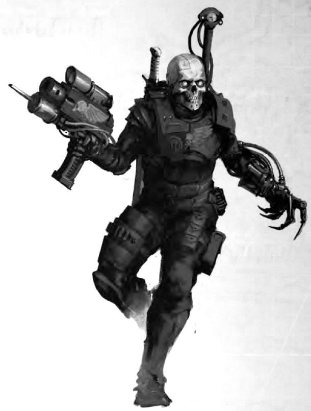Обернувшись, жрец видит бегущую к нему с огромной скоростью фигуру, одетую в черное, со шлемом в форме черепа на голове. При этом фигура не перестает орать, и оставляет за собой след из крови и внутренностей, вслепую стреляя из болт-пистолета во все стороны.