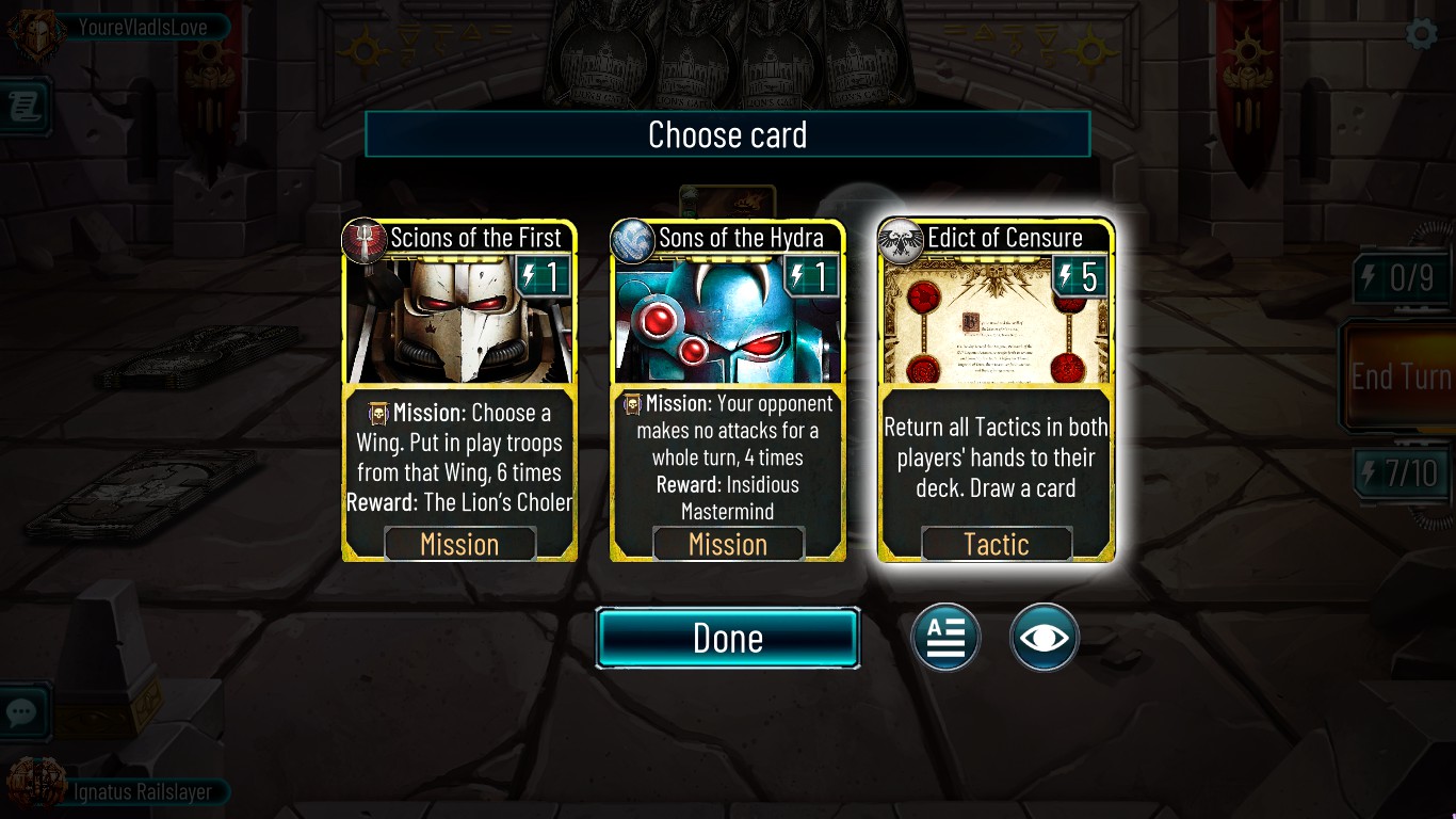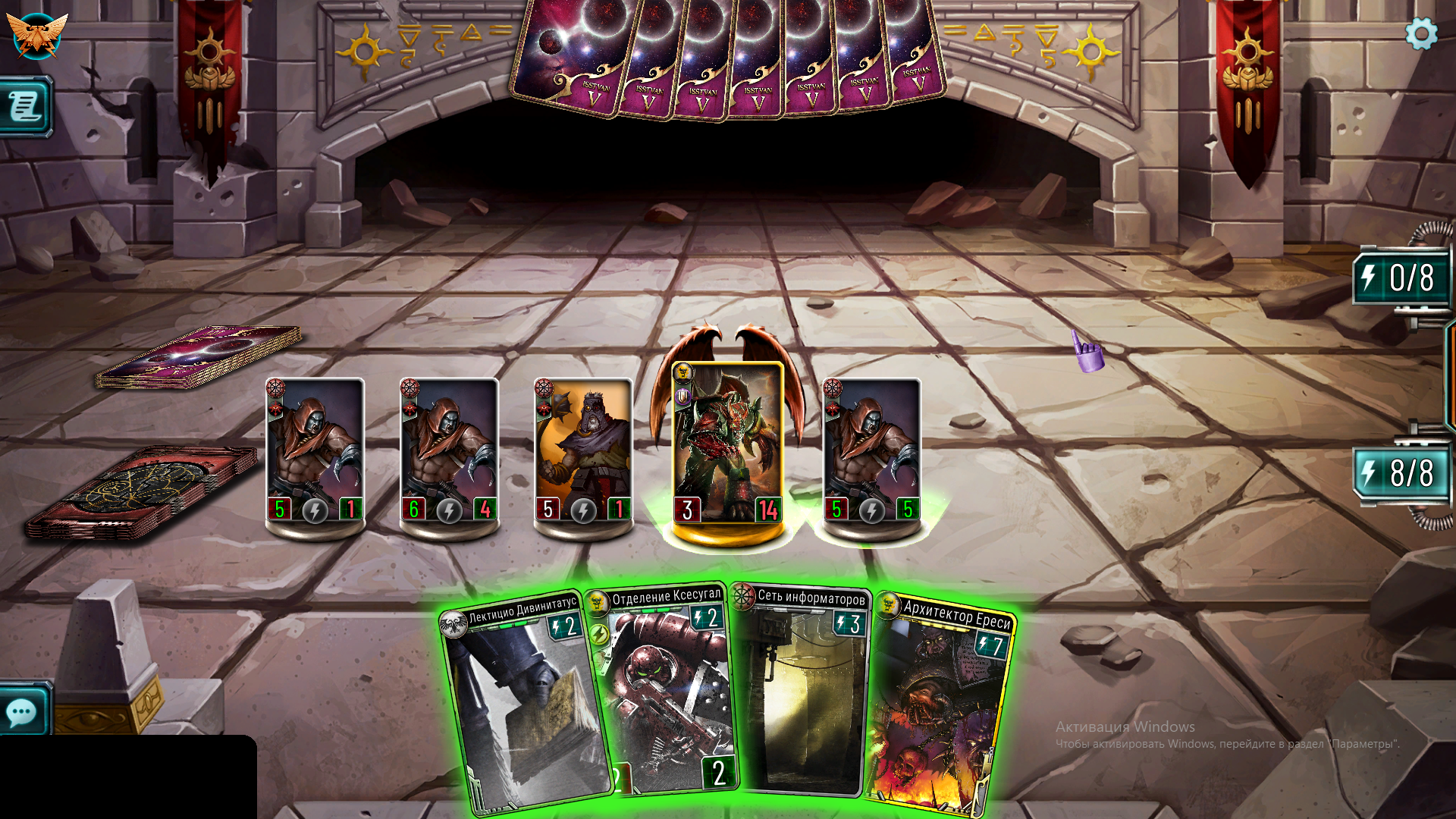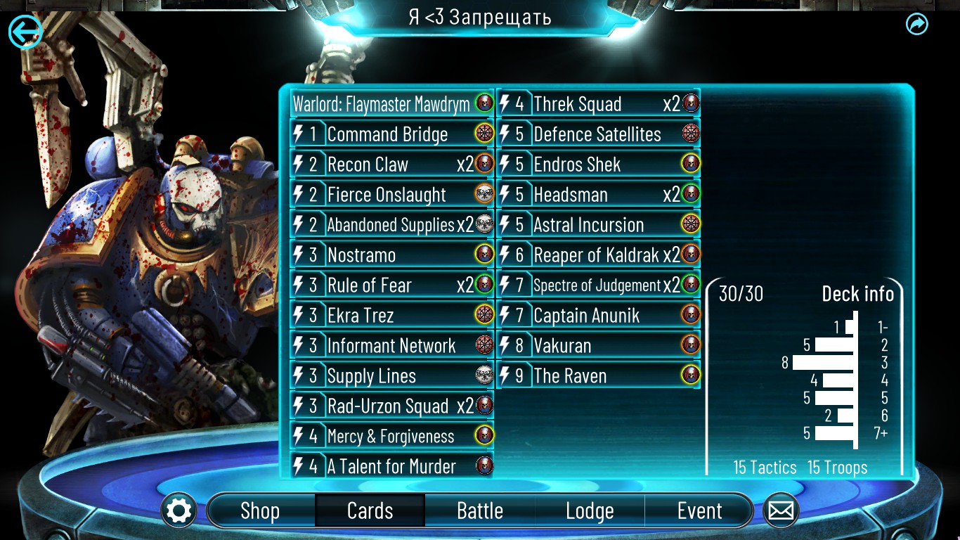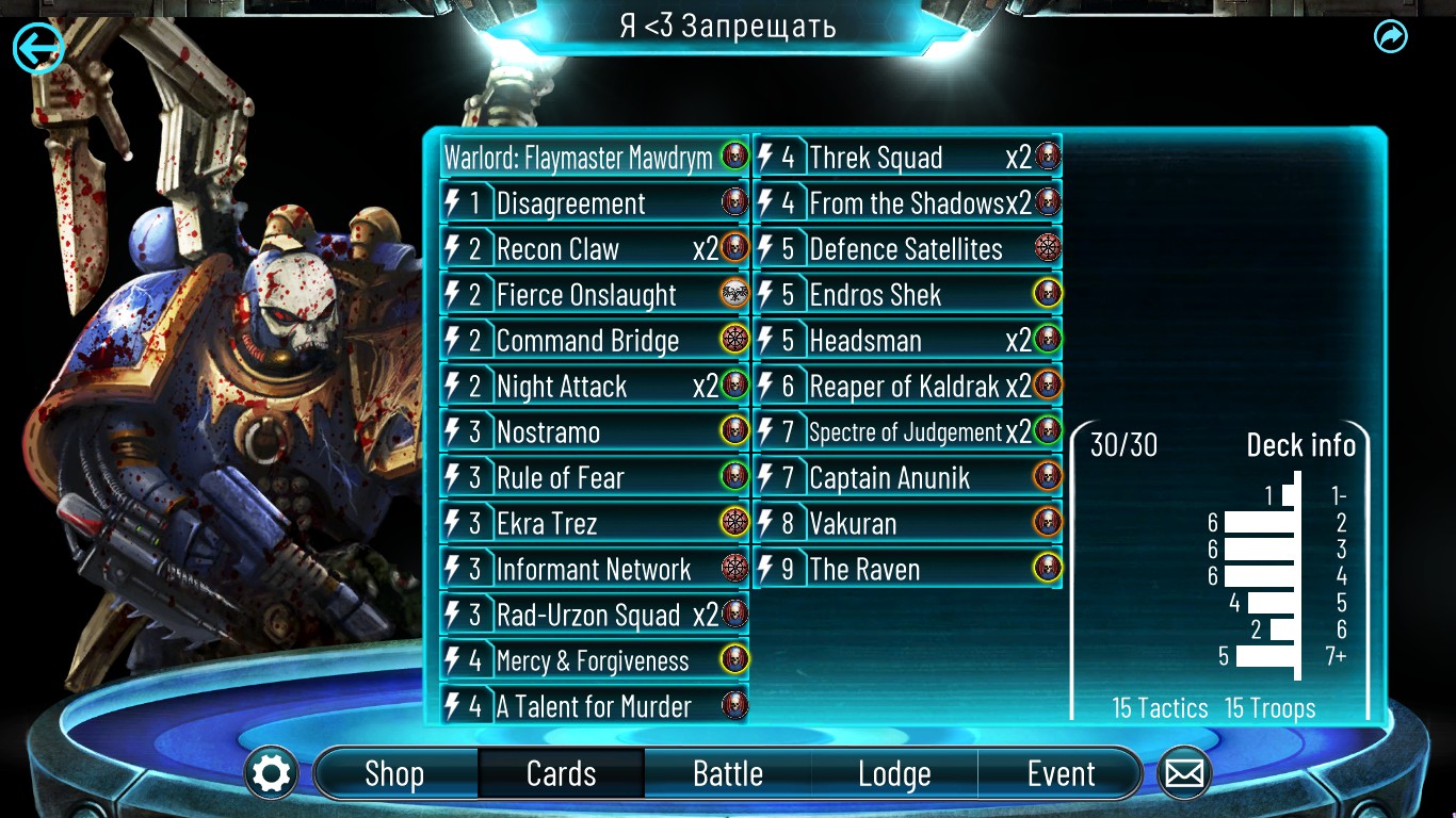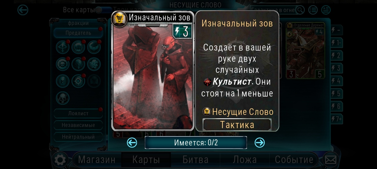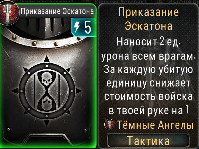 Или у ТС: вроде и активировать в затяжной катке не так сложно, особенно если играть тушки, вроде 4/4, которые сходу ПС генерируют, и награда нормальная - псайкер 3 командиру это пиздато, но генерация психосил в руке - это кал говна, потому что миссия для затяжной игры, но: 1. ты вынужден каждый ход выкидывать минимум 1 психосилу, причем рандомную, банально чтоб рука не забивалась - ты не можешь копить пси-энергию для жесткого раскаста, ты ВЫНУЖДЕН её тратить. Конечно, можно позволить ей просто сгорать, но тогда и ты сам не можешь чесать деку (об этом я еще ниже напишу), и тебе могут карты сжечь лектицио. 2. если обычно книга Магнуса полезна тем, что ты просто имеешь в деке 3 психосилы - ремув, астралка и добор - и гарантированно при прожатии книги получаешь все их в руку, но после миссии тебе в руку легко накидает гамна; 3. несколько психосил добирают карты, исчисление - сразу три, и видение будущего - одну. То есть ты их даже разыграть нормально не можешь, чтоб руку от лишних психосил почистить. Какие же ЕГ дауны просто. Сделали бы спецкарту, как у кустов копье - разыгрываешь её, скажем, за 3 психосилы - и на выбор тянешь психическую спеллу; не разыгрываешь - она сгорает в конце твоего хода. Но нет, надо всрать миссию, нельзя, чтоб у фанового легиона была хорошая миссия.