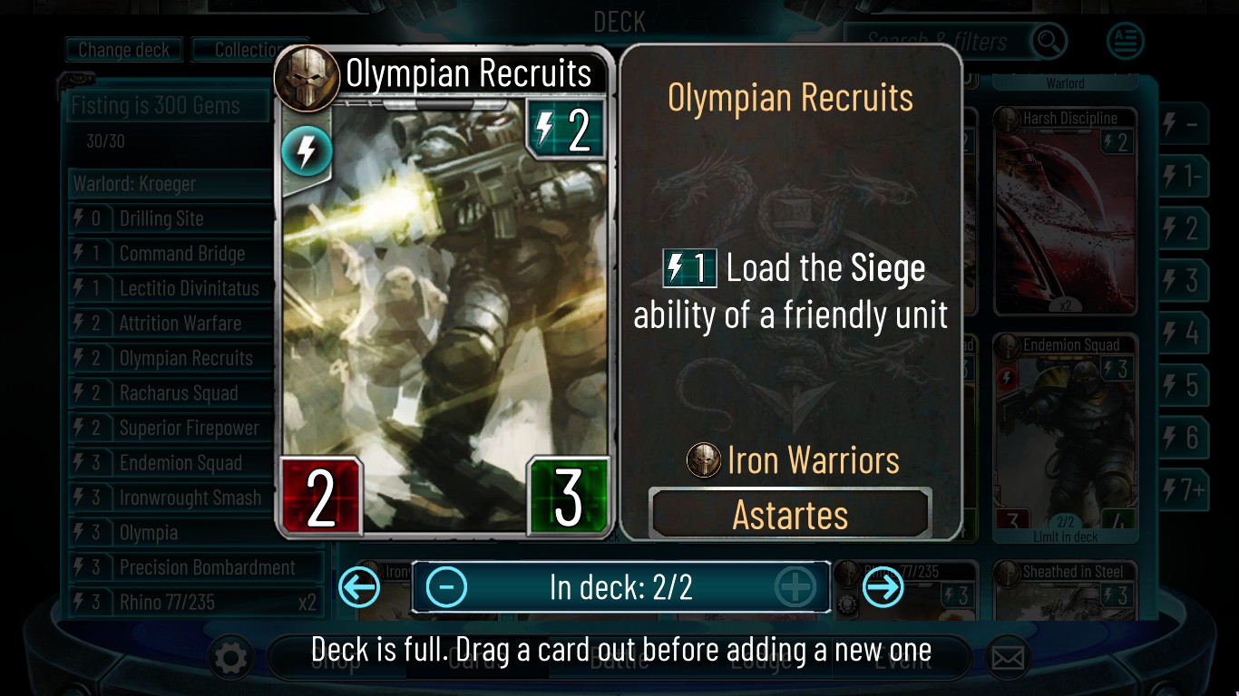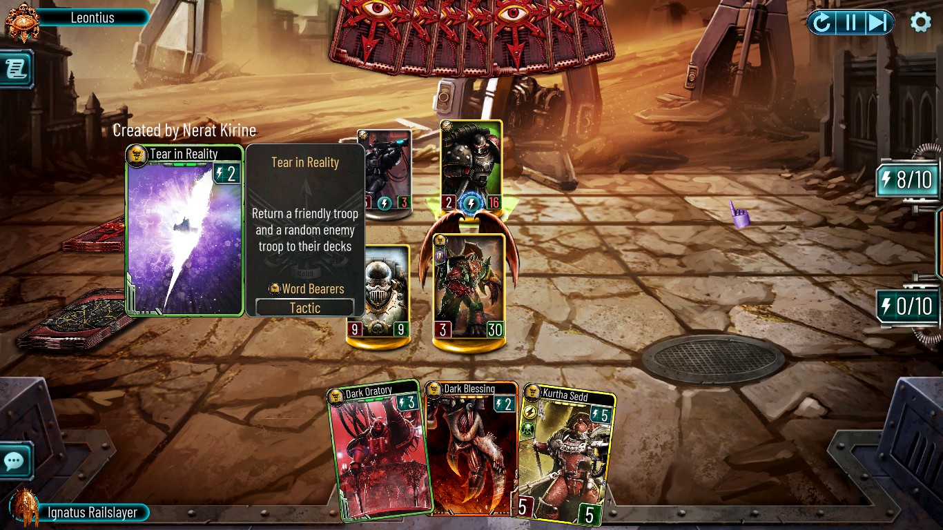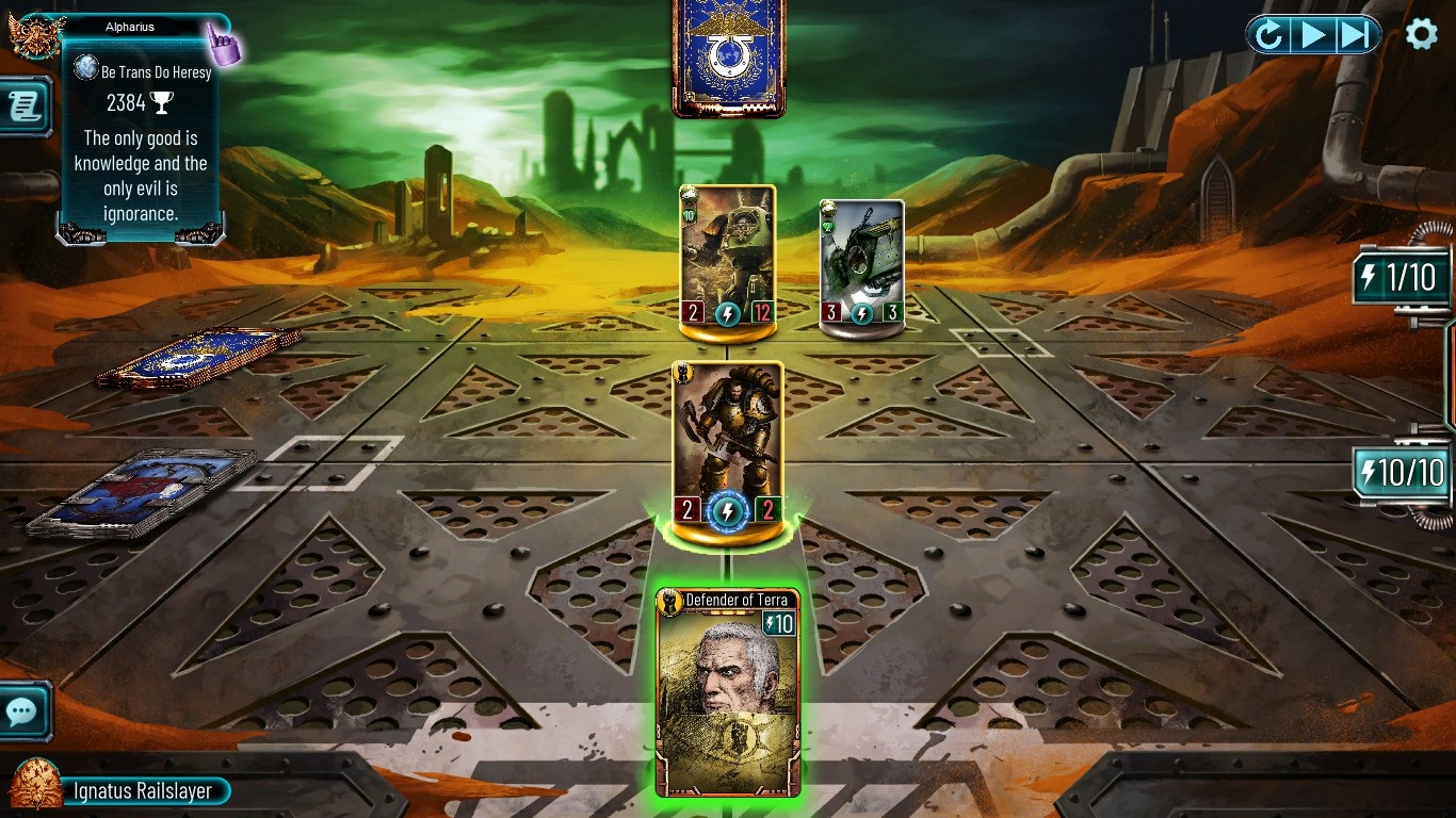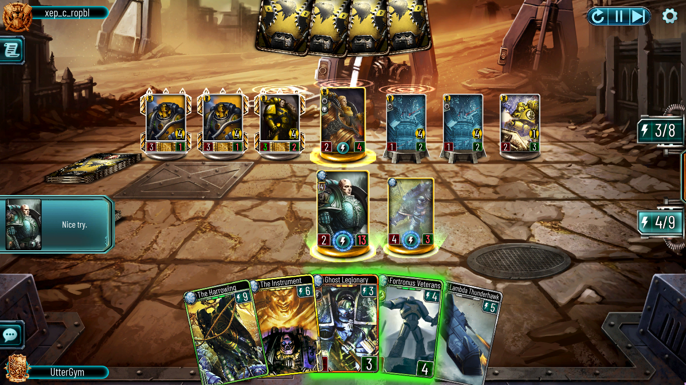Или у ТС: вроде и активировать в затяжной катке не так сложно, особенно если играть тушки, вроде 4/4, которые сходу ПС генерируют, и награда нормальная - псайкер 3 командиру это пиздато, но генерация психосил в руке - это кал говна, потому что миссия для затяжной игры, но: 1. ты вынужден каждый ход выкидывать минимум 1 психосилу, причем рандомную, банально чтоб рука не забивалась - ты не можешь копить пси-энергию для жесткого раскаста, ты ВЫНУЖДЕН её тратить. Конечно, можно позволить ей просто сгорать, но тогда и ты сам не можешь чесать деку (об этом я еще ниже напишу), и тебе могут карты сжечь лектицио. 2. если обычно книга Магнуса полезна тем, что ты просто имеешь в деке 3 психосилы - ремув, астралка и добор - и гарантированно при прожатии книги получаешь все их в руку, но после миссии тебе в руку легко накидает гамна; 3. несколько психосил добирают карты, исчисление - сразу три, и видение будущего - одну. То есть ты их даже разыграть нормально не можешь, чтоб руку от лишних психосил почистить. Какие же ЕГ дауны просто. Сделали бы спецкарту, как у кустов копье - разыгрываешь её, скажем, за 3 психосилы - и на выбор тянешь психическую спеллу; не разыгрываешь - она сгорает в конце твоего хода. Но нет, надо всрать миссию, нельзя, чтоб у фанового легиона была хорошая миссия.
