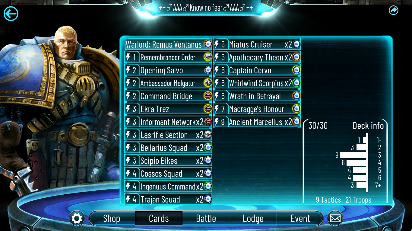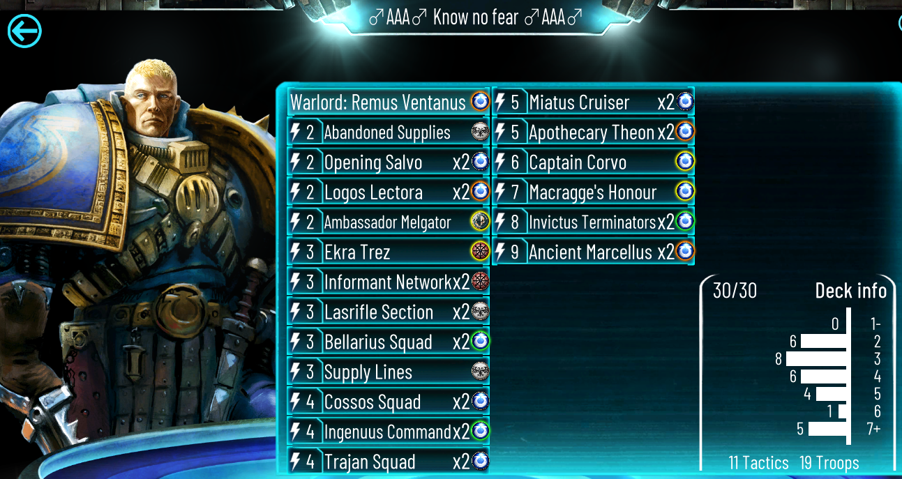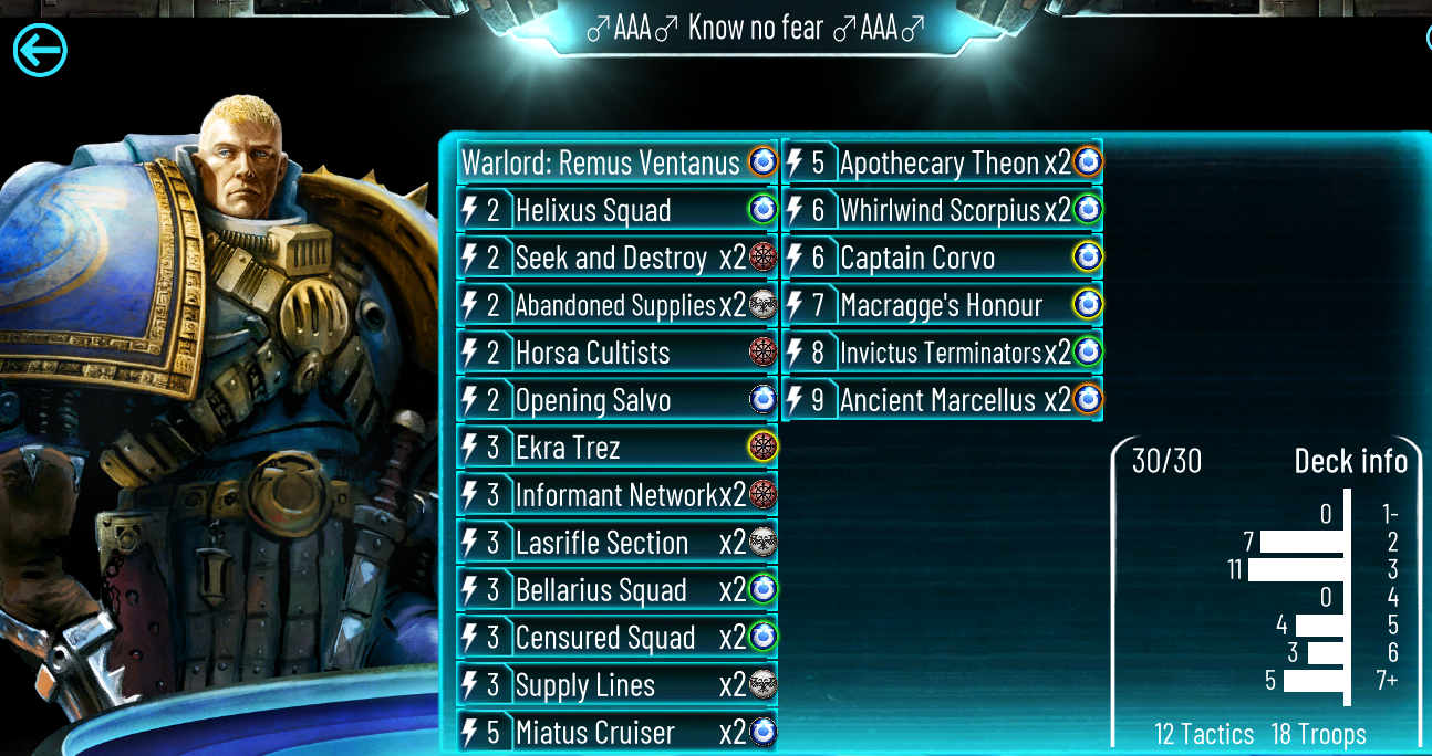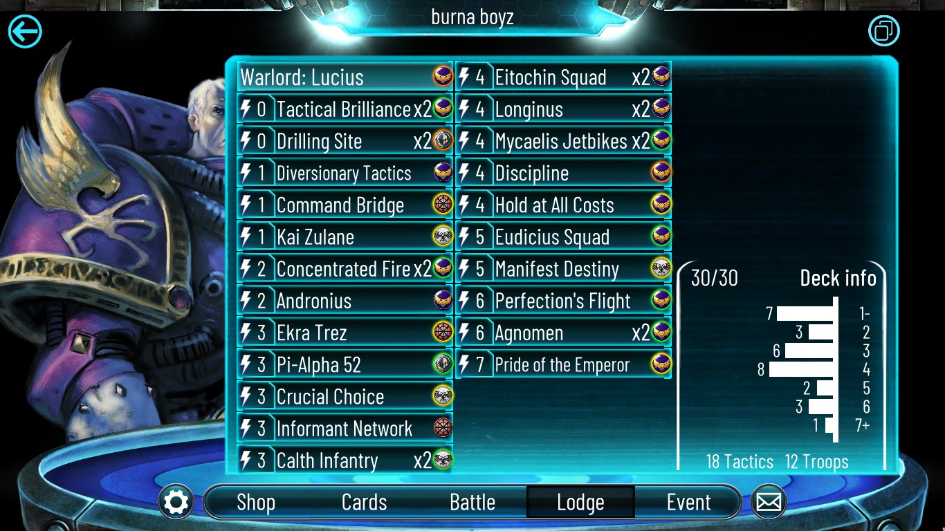 >>127498 щас доборов нету, лектицио скока стоит, 2? припас за 2, удешевляет на 1. ну и нах такой добор? допустим ты ультрамарин, взял 2 припаса и 2 логоса отобрал у Перта нах лекторы...и че? как ты на 26 карт оставшихся возьмёшь всё что нужно? да никак. правило железное: всего нужно брать по 2 (кроме некоторых тактик и 10-к), соооу, за вычетом 3-х лег это 23 карты, т.е. 11 трупсов, а на самом деле не 11 а 7-8, т.к. ещё тактики нужны. ок, 1 антистелс х2 (+ х2 сетка в тактиках), остаётся 6-7 трупсов легионных. из них должны быть 1 семёрка, 2 шестёрки, 1 пятёрка, 2 четвёрки, 1 тройка и...и что дальше? не хватает места, говорю же