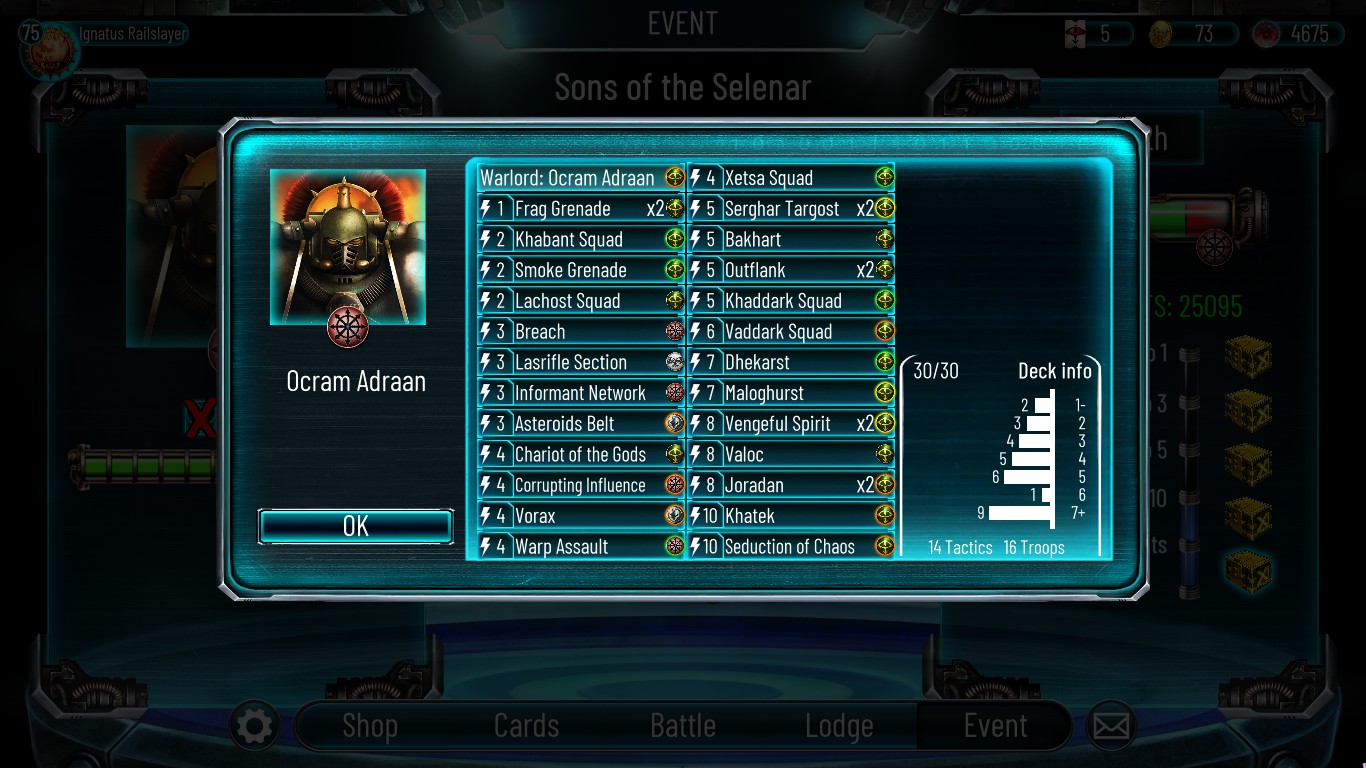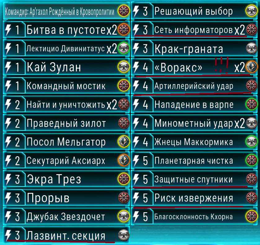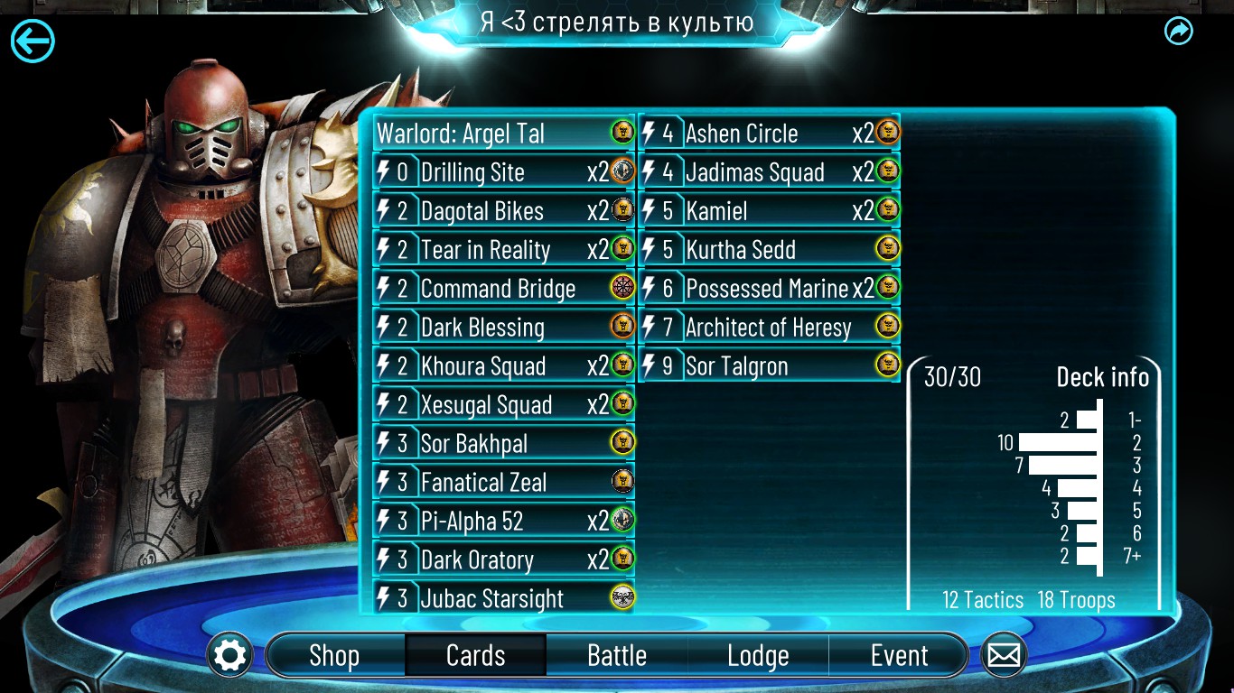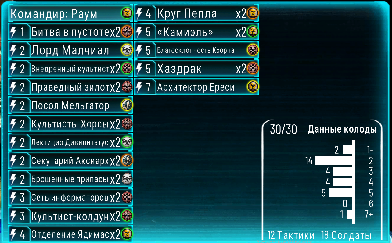 >>123788 >>123789 Скрин колоды религия имперский культ не позволяет сделать? Два клинка - дохуя Мутирующие астартес две штуки - дохуя Два одержимых тож думаю дохуя, возьми одного и не еби себе мозги.