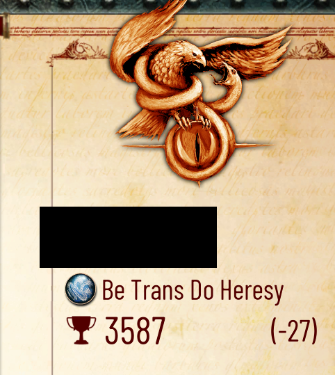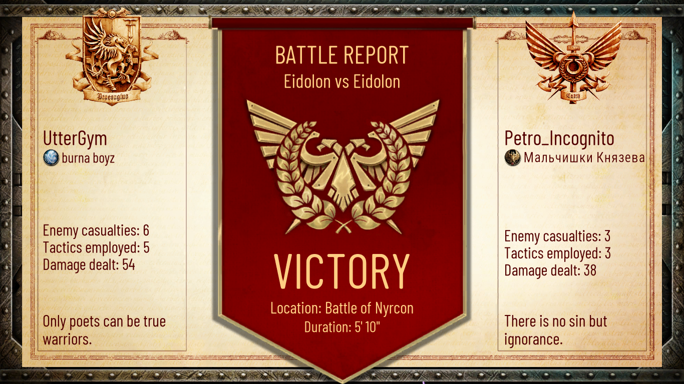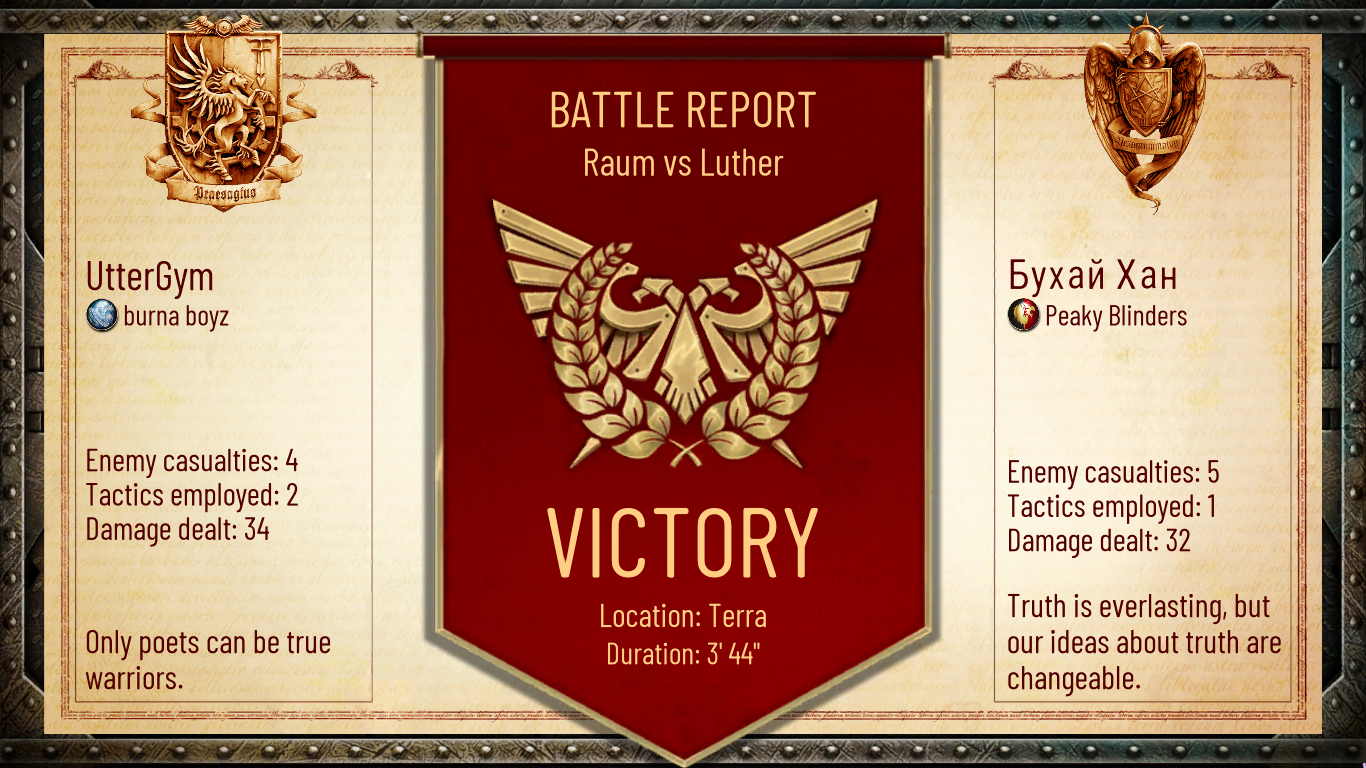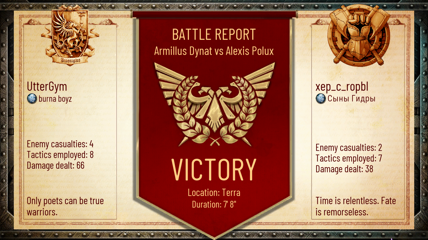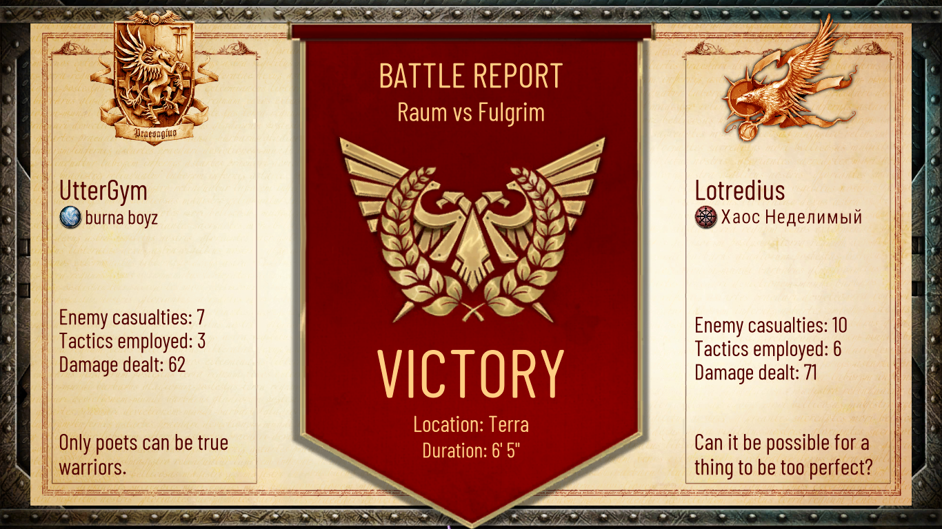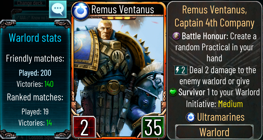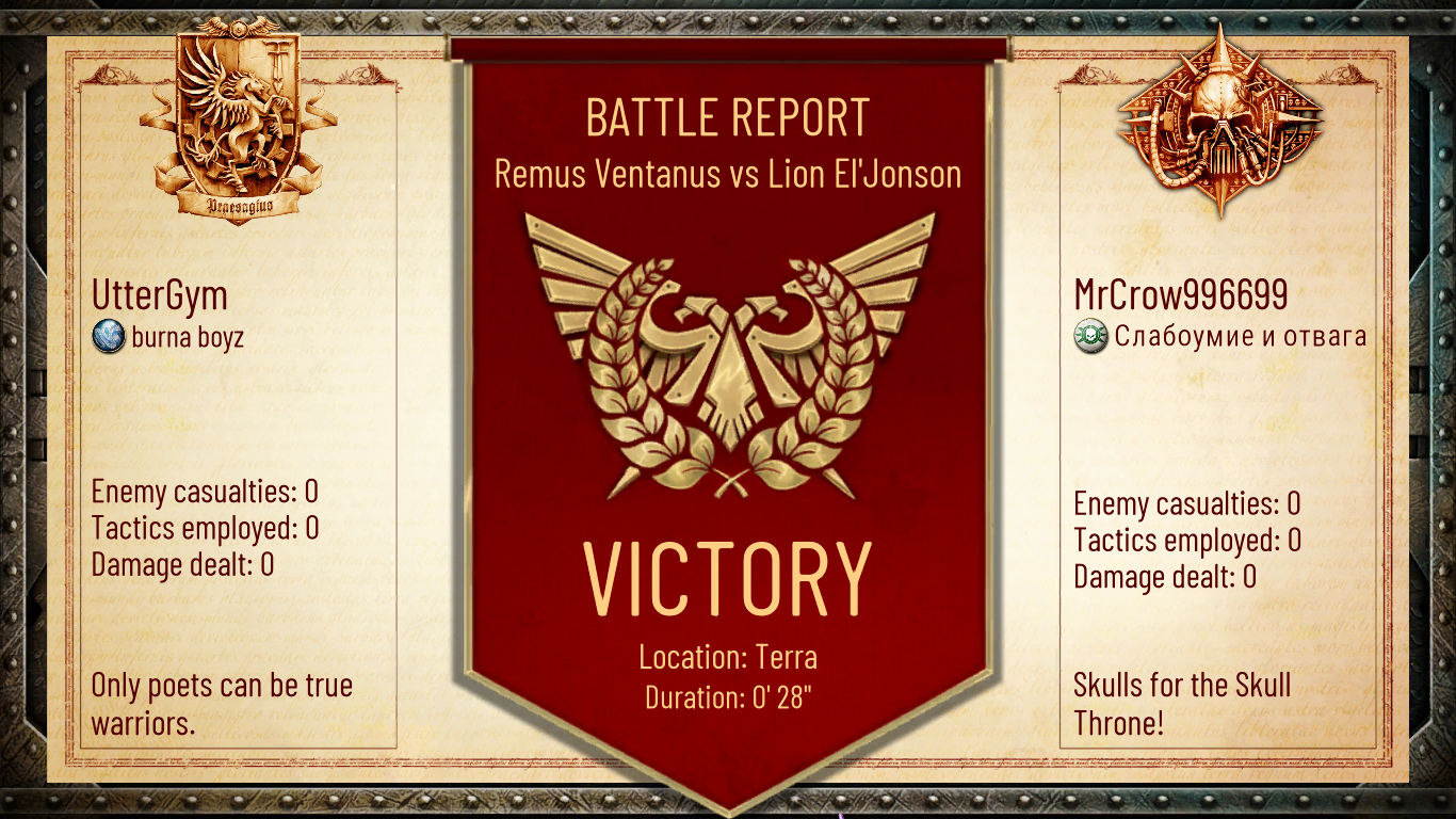 Оцените мой прогресс: за 100 боёв на Ремусе Вентанусе довёл винрейт до 60%. Хотя сначала был чисто для рофла-дейликов, ничего не умел. Оказалось - самая тугая верзоха на всём Ультрамаре и орёт к тому же знатно. Рекомендую. Квирки, ты чего онлайн сидишь, я тебя вижу, раскодировался штоль? Давай ко мне в ложу, обратно к мужебратьям нам пути нет.