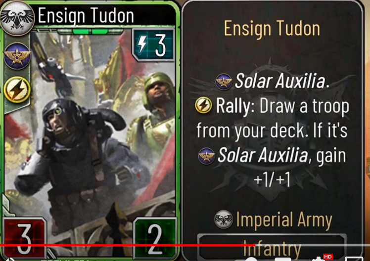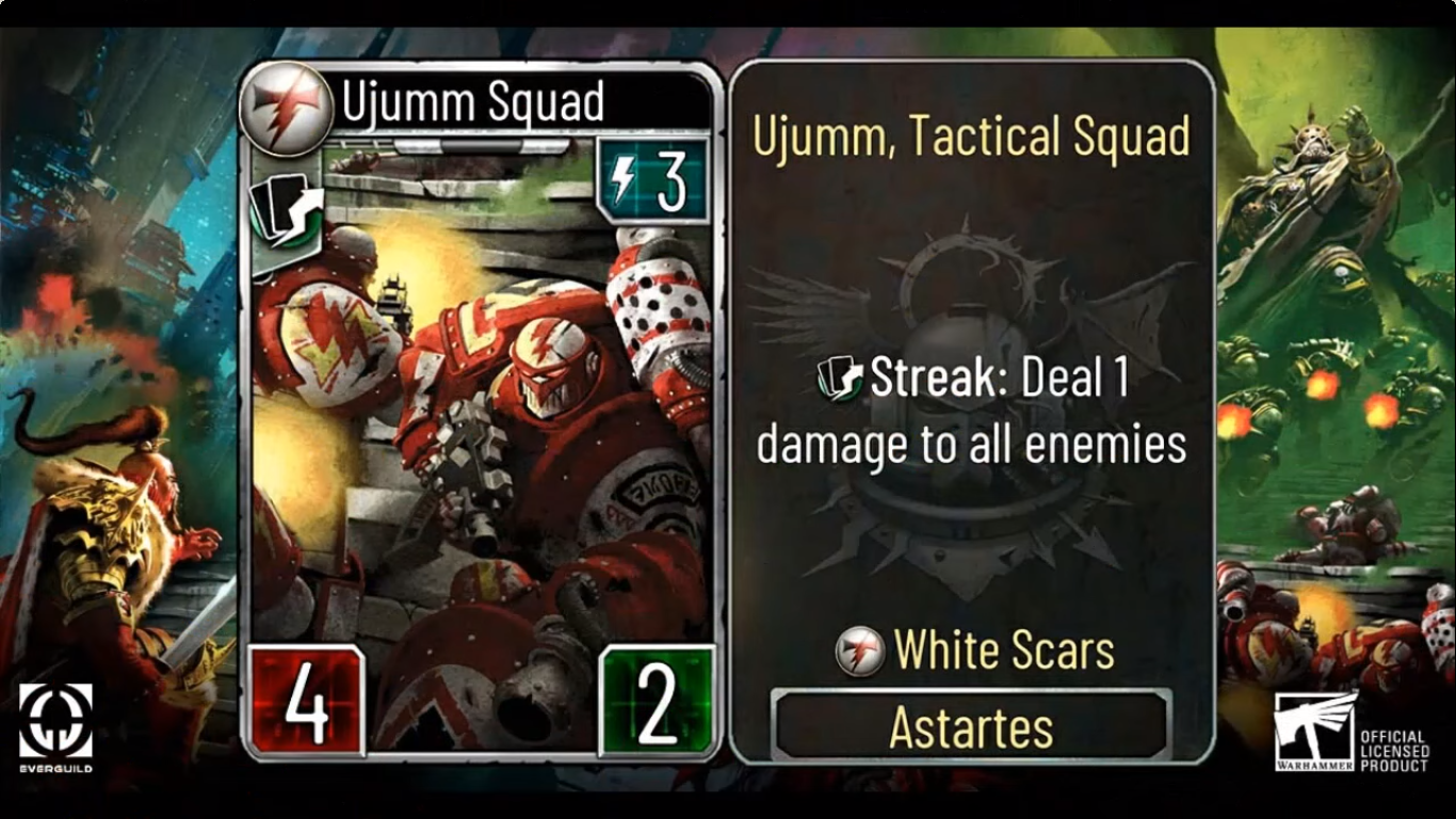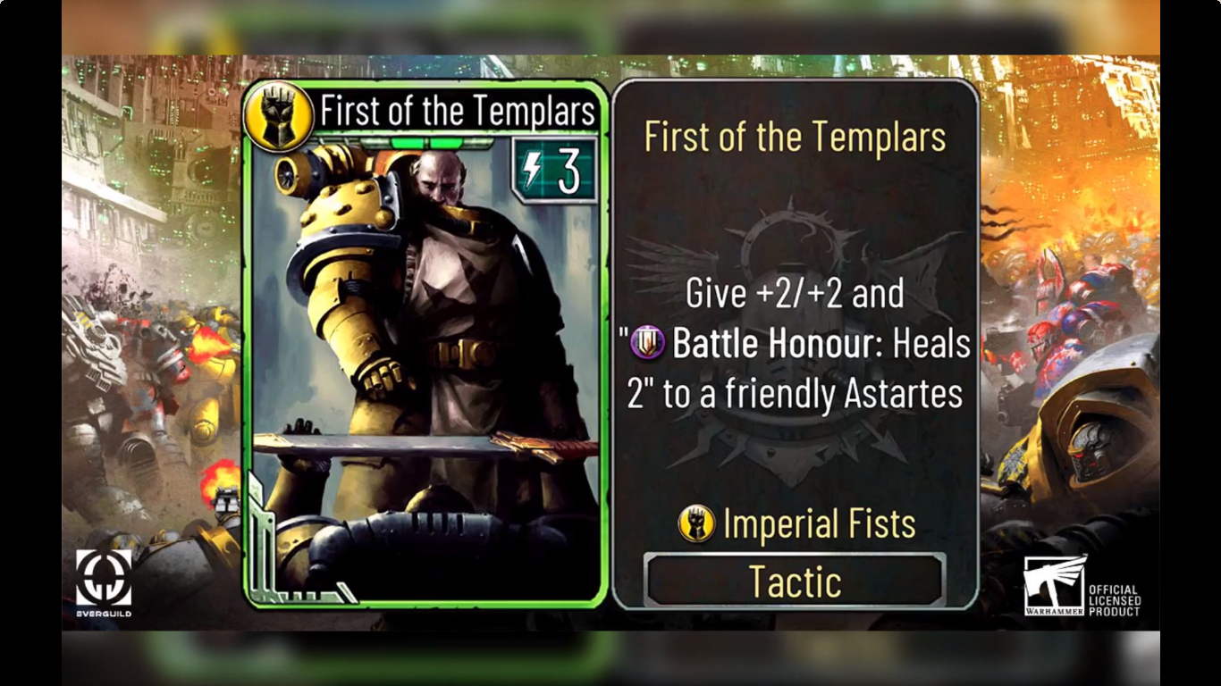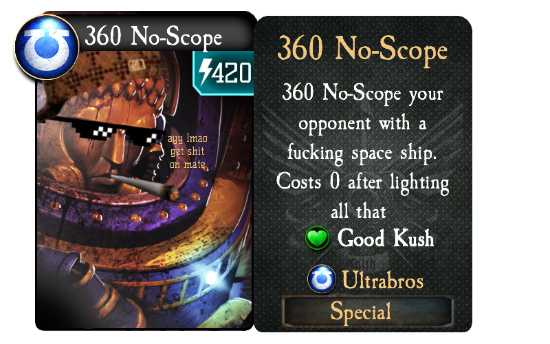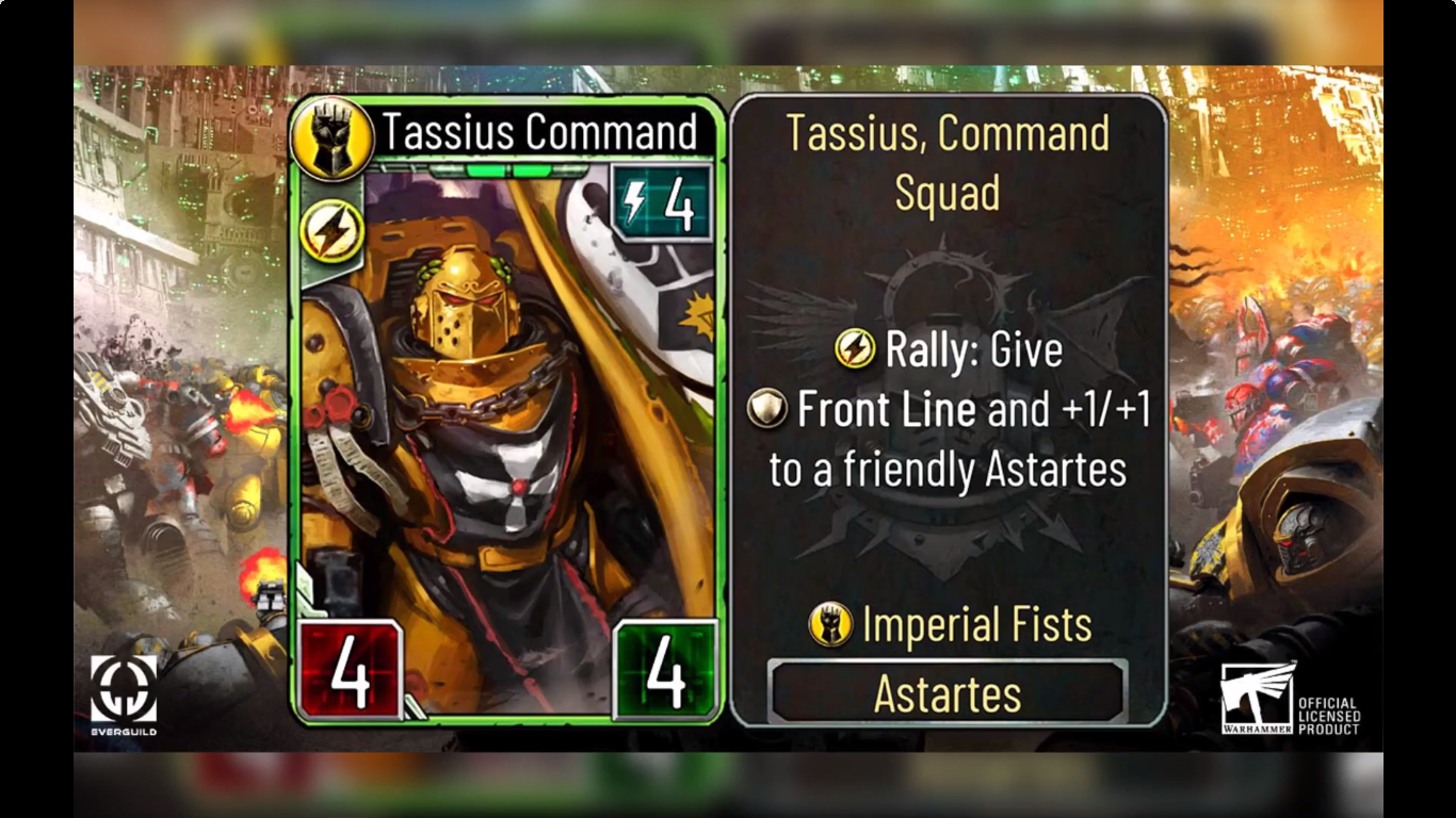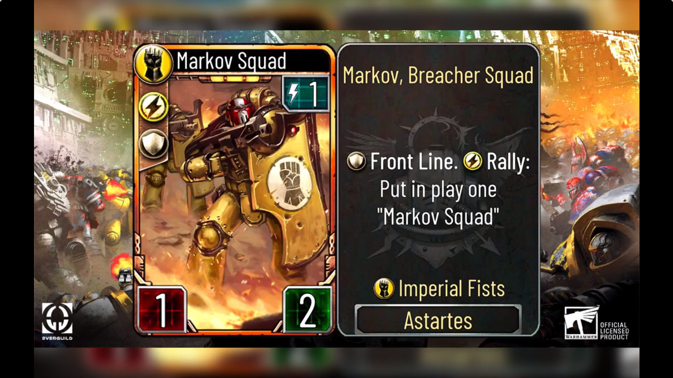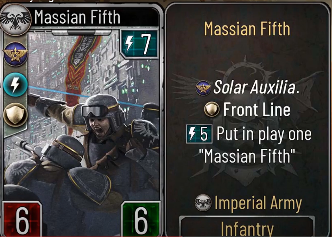 >>123268 Потому и добор стоит 2, что он примарх. Хуисосы в ЕГ думают, что 40 хп - это настолько невъебенный бонус, что давать командиру адекватную абилку и не надо. А у Левы мало того, что Расплата трудная, так еще и говно, потому что он на ней чисто проебывает ход, получая +1/0 - и после этого ему нужен стол для её прокаста, чтоб баф дать, который к тому моменту или снесут, или который и без расплаты зарешает. Лева должен быть такой: абилка за 2 маны - выберите крыло и возьмите из колоды астартес этого крыла, если нет в колоде - создайте. Расплата стоит 18 и удешевляется на 3. В Расплате Лев получает +1/0 и способность за 2 - "Обновите Квесты ваших солдат (в смысле - выполненные квесты зарядите заново) и дайте +1/1 всем солдатам с чертой Квест").