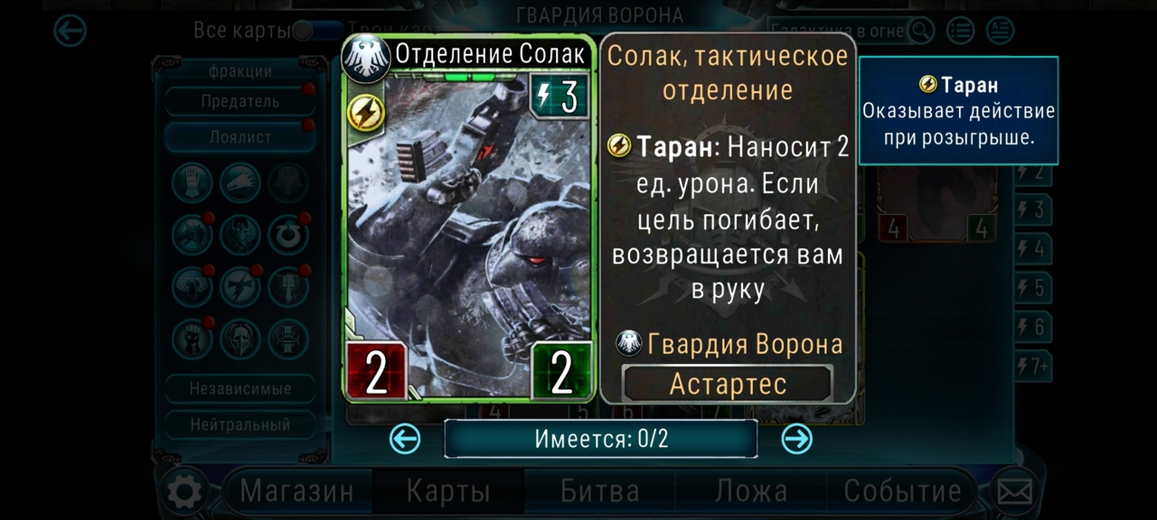 Про карты эффект+добор, вроде того же нечестного бойца у ПН, или орбитального боя у сала, который удорожает вражеские тактики, и говорить не стоит. Или 3/3 у агентов, который если убивает единичкой урона с тарана - то добирает карту. Или даже орбиталка, которая вообще не добирает, но даёт потенциально ДРУГИЕ карты, которые может быть более пригодны в этом бою (хотя орбиталка шлак, и годилась только старой Альфе на копье).