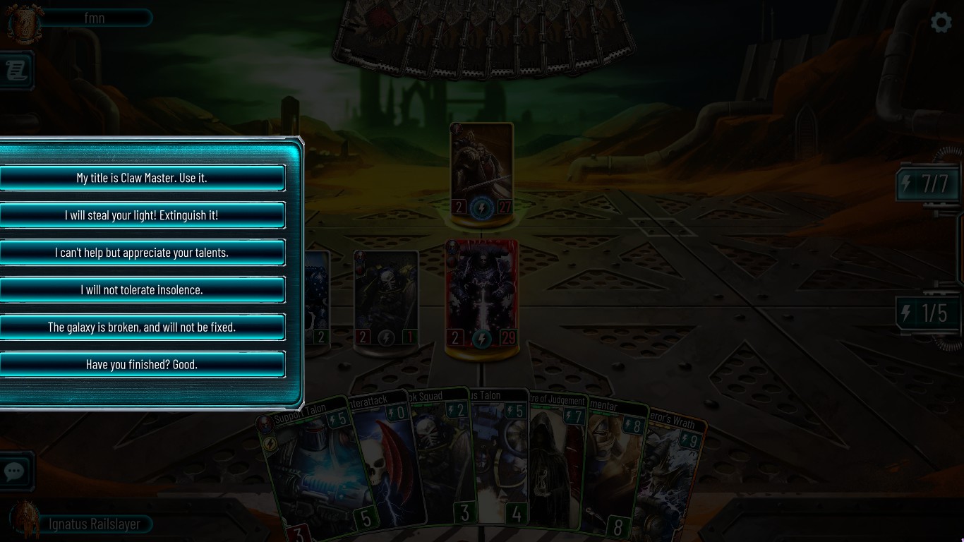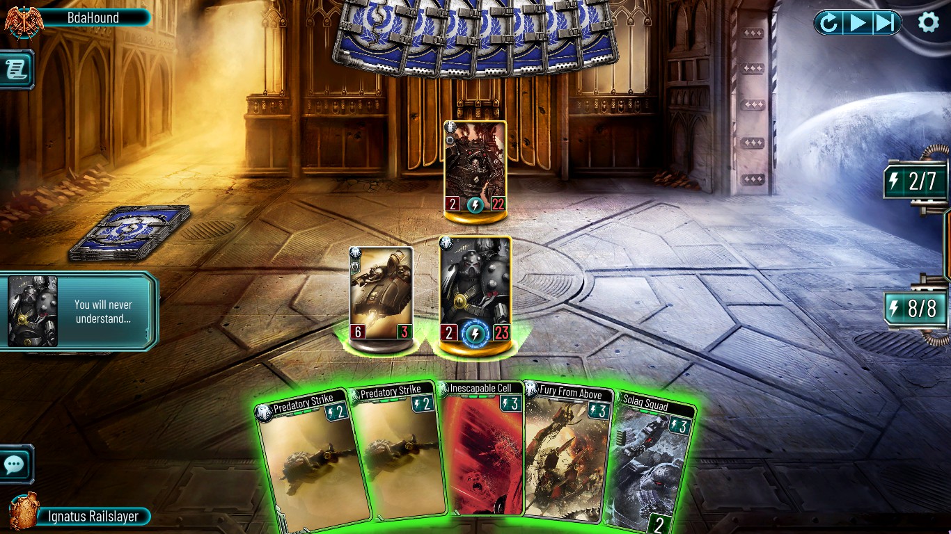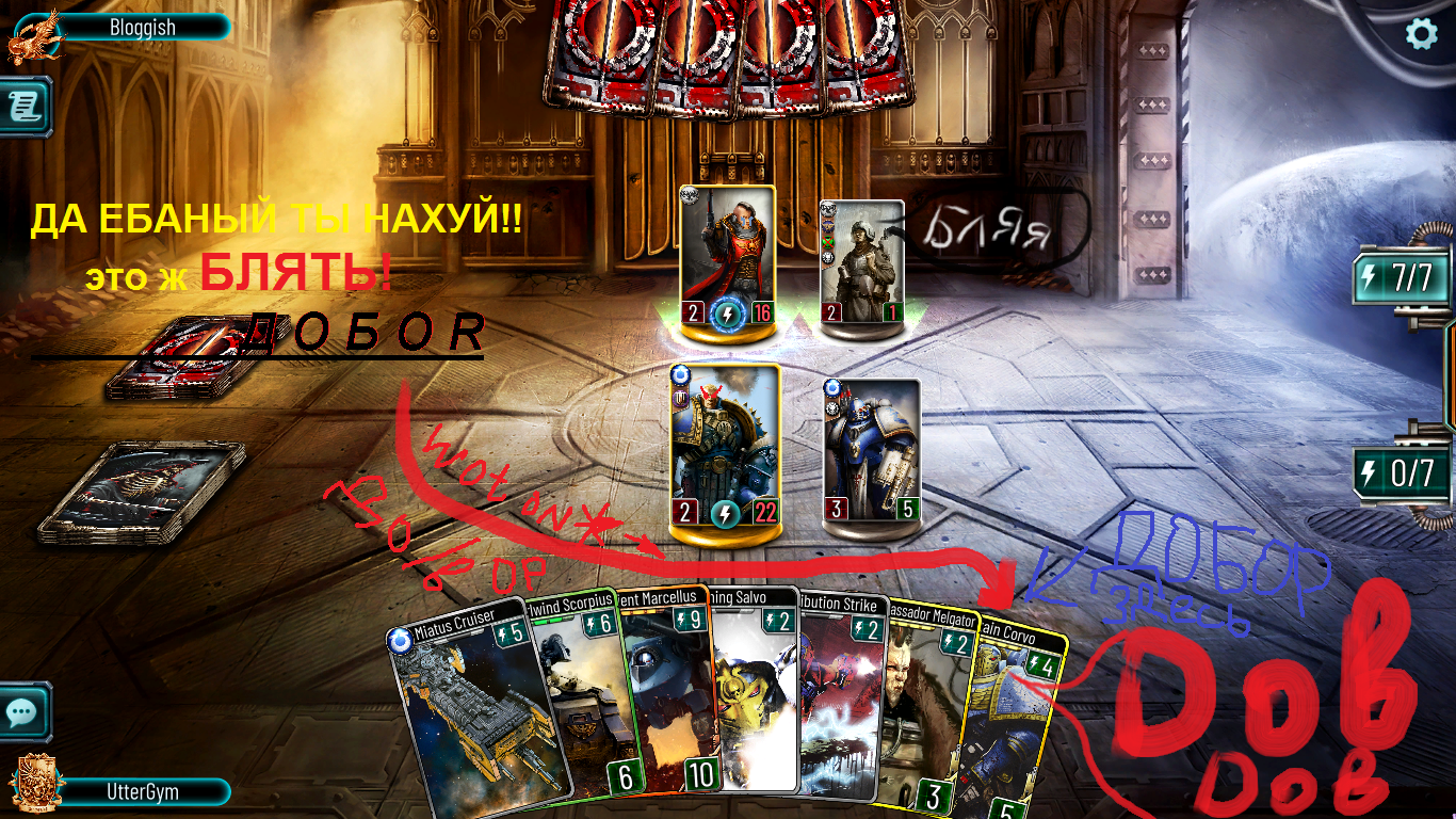 Вот прям кому интересно, Сангвиний сидит без карт перманентно. То, блядь фланк астартес зайдет - ну астартес нет и похуй что вся рука в тактичках, только хуевых. Меч там беспонтовый, копья и призрак, нолик-стелс. И вот заходит тебе царь астартес - чтобы тут же получить размен от минометного удара. И сидишь ты с пустой рукой. А на 10 мане, когда тебе пизда - заходит книжка. Добирай свои 2-3 дропы, они сейчас нужны. Даже ебучий выбор, если в руке - то даст хуиту, а-ля тайна та. И хуй знает, как играть, это ведь у тебя рука пустая, а самые странные колоды у оппонента - играют. То есть это даже не вопрос баланса, это вопрос именно того, как игра сделана.