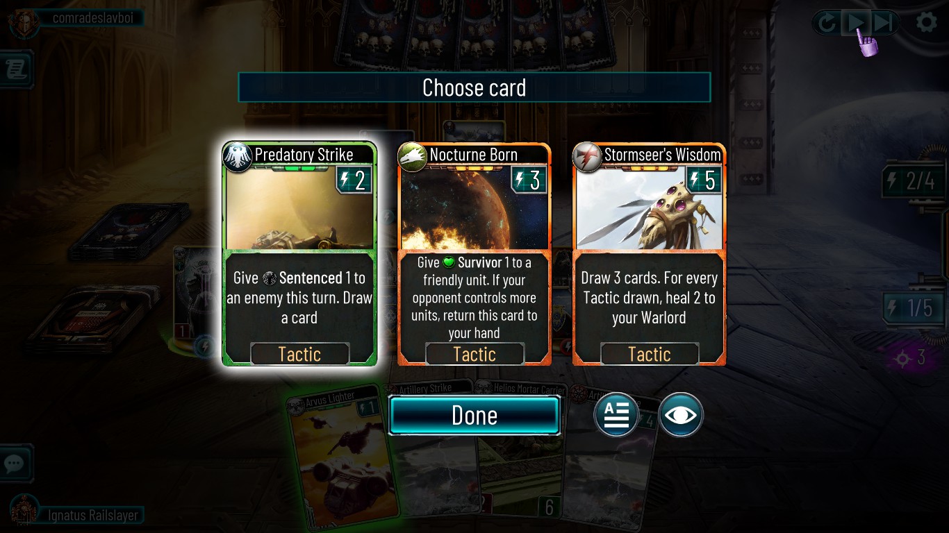 >>127500 добор нужен тот, который даёт выбор из 3-х. но он такой один на всю игру. есть ещё доборы КА и ультов, полезная вещь, добавил бы в колоду но у меня ультровских нет. а "возьми случайную карту и удешеви на 1" это такой себе контроль колоды, не находишь? потому что вместо добора ты мог бы уже иметь случайную карту в руке, и она была бы полезна, ведь это твой декбилдинг. а добор бесполезен и тратит 1 энергии к тому же набор большого числа карт (лега ДИ, мортарион резолв) тоже кстати норм а вот лецитин даёт карту противнику, и так рисковать я не собираюсь