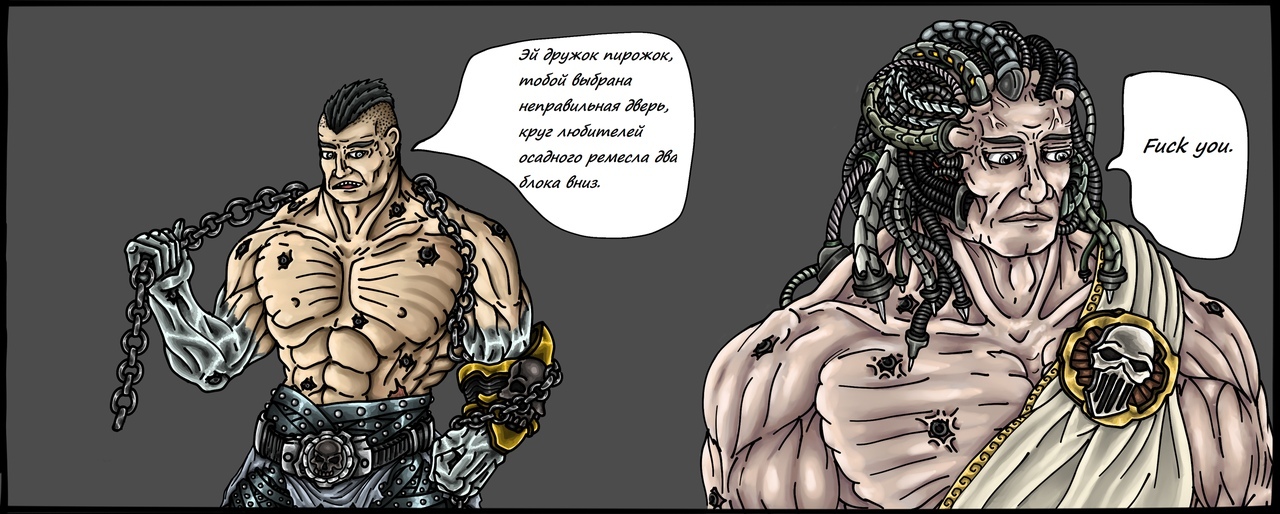 >Навстречу гостям шагали четверо, вышедшие ради них под дождь. Трое из них были легионерами в громоздкой начищенной броне цвета железа, которая в тени выглядела синевато-серой. Бойцы ступали плечом к плечу, в левой руке каждый держал выгнутый прямоугольный щит, на правом боку у всех троих висели гладии в ножнах. Возглавлял их Пертурабо Олимпийский. Атхарва споткнулся, увидев Железного Владыку. Сука, уже со щитами и гладиями. Где болтеры? Перт все средства ОСВОИЛ со своим Трезубцем, а бойцы, блять, с гладиями ходят.