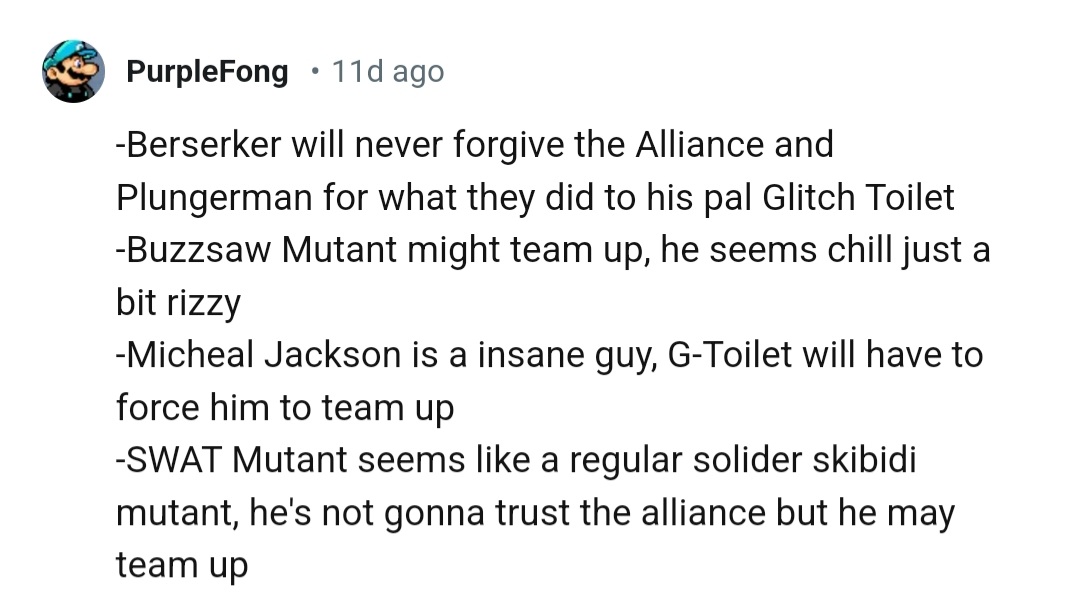 В ответ: Ага, а как он в последний момент произнёс Скибиди, таким голосом, будто говоря: -"прошу не надо". Рад, что унитазики стали с альянсом дружить, астроугнетатели слишкком имбовые.