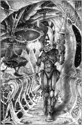 "Кариадрил кивнул и стал разглядывать изображения на дисплеях, витавших над его головой. Он увидел, как маленькие точки челноков и космических истребителей отделились от громады человеческого корабля. Несколько мгновений ясновидящий изучал его необычные грубоватые очертания, разглядывая его борта, испещренные люками ангаров и орудийными установками. Многие эльдары считали человеческие корабли типичными грубыми и примитивными изделиями мон-кеи, но самого Кариадрила в глубине души они очень пугали. Гигантские и страшные, они казались вечными и неуязвимыми по сравнению с изящными и хрупкими на вид кораблями эльдаров. Кариадрил мог только строить догадки о численности экипажа человеческого корабля, но прекрасно понимал, что их гораздо больше тысячи с небольшим эльдаров на борту «Вуален-Шо». А сколько тысяч или десятков тысяч таких судов разбросано по всей Галактике? На самом же Ан-Илоизе имелось лишь несколько кораблей, которые всегда курсировали рядом, охраняя родной искусственный мир. Даже если объединить все эскадры со всех эльдарских миров, вряд ли соберется сила, способная соперничать с человеческим Боевым флотом, действующим в одном только Готическом Секторе. Кариадрил с грустью напомнил себе о том, что его раса вымирает. С каждым днем их становится все меньше, а людей - все больше. Скоро эльдаров, наверное, совсем не останется… Кто же будет хранить наследие предков?".