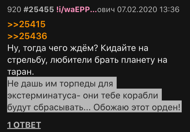 >>25415 >>25436 Ну, тогда чего ждём? Кидайте на стрельбу, любители брать планету на таран. Не дашь им торпеды для экстерминатуса- они тебе корабли будут сбрасывать... Обожаю этот орден!