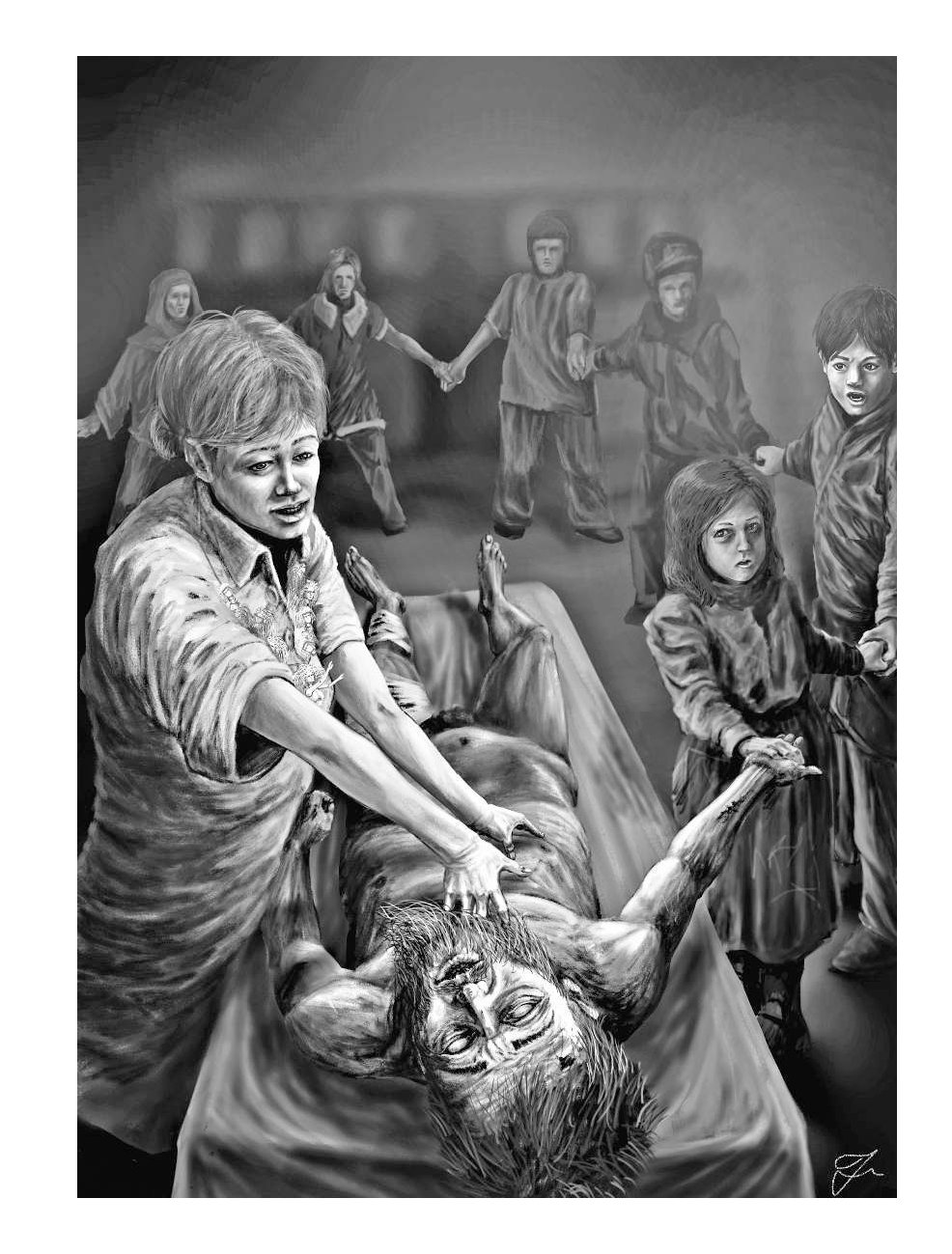 Они плясали на его ретинальном дисплее- грязные, худые,в рваных ночных рубашках, джинсах,платьицах... Но все -весёлые. Камера поднялась и Хранитель понял,что Зумиристон встал. Он хотел крикнуть ему, чтобы он немедленно вернулся обратно, за парапет из мощного камня, но не успел ничего казать. Камера показывала целую равнину, обожжённых до черноты ударами корабельных лазерных огнемётов скелетов. Целая равнина детских костей.