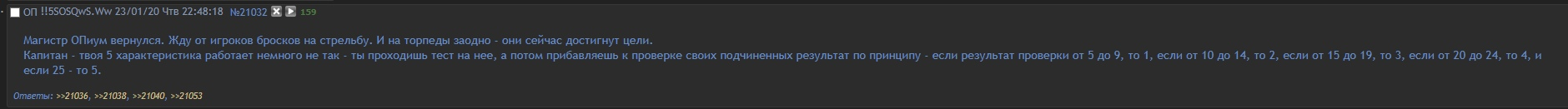 >>26089 >Точно кок же мастер! Нет. >А не удачные не отмечались. Это когда Кок,чуть не подстрелил из корабельного орудия дропподы? Это этот выстрел я не учёл? Про последнюю его эпическую стрельбу я ещё просто не успел написать. >Отлично. Ну после того,как огрин-капеллан высказался в треде по поводу кадианцев,стало несколько бессмысленно хранить интригу. Как могли-так и оформили. >Разговаривать за героев Новект сам, выше по треду, предложил Комарго пошукать в варпе. Как иначе он мог это предложить в игре, кроме как воксировав на шаттл? >и вступать за них в хтх. Это было. Но там был ХТХ уровня стрельбы по мишеням(Или надо было покидать проверок на то,кто кого отпиздит? Здоровенный и опытный офицер космодесанта или голодный школьник?) и внеплановое приземление, потому что я не так трактовал его посты. И этот косяк мы,с братом Новектом, кажется, уладили. >А вот стрелять орбиталками за брата Кока Я ни за кого не стрелял ничем. >Точно кок же мастер! Ни-ху-я >26091 На всё ваша воля.Ну , то есть не ваша, призрак Совести. А брата Новекта, брата Зумиристона и теперь уже не уверен,что брата Кока. Слушай,призрак моей Совести,а почему ты похож на капеллана? Атомные торпеды у вас есть. Лэнсы тоже. Можете не ждать экспертизы Камарго. Можете даже взять из апотекариона на крейсере силовые смирительные рубашки и погрузить Девятку, которой надо лично убедиться,что Василлий сдох, в шаттл и шарахнуть. Торпед для экстерминатуса у нас пока нет, но шарахнуть и повесить маячок о мундис экскоммуниката вполне возможно.