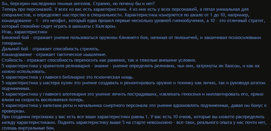 >>28451 Ну, это десант, да. У нас есть капеллан, который неизвестно сколько воевал и неизвестно как выжил в другом ордене, прежде чем тот уничтожили, мы активно поддерживаем связи с со старшими братьями, у нас есть опытные офицеры, которые не вчера появились. При таком положении дел, удивительно было бы не знать о многих угрозах этой опасной галактики. Другой вопрос, что многие из них братья видели только на планшетах и тренировочных голограммах.