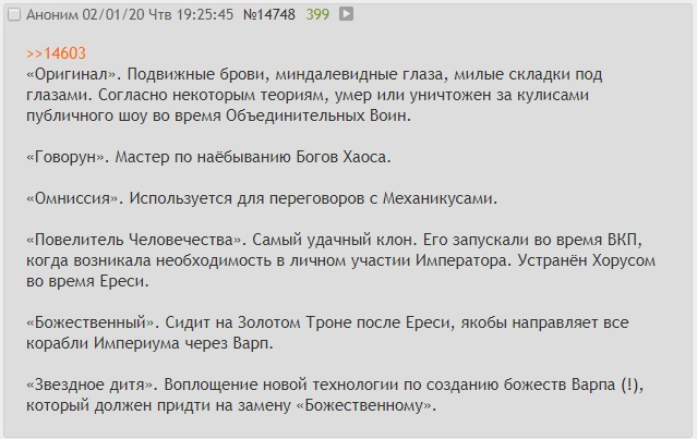 Сам много раз коверкал имена примархов, да и многие в жирнотреде коверкали, но так и не понял, почему какой-то залетный жмых в литературо треде тогда порвался с безобидного имперяна, которого я придумал. Проанализировав, я пришел к простому выводу. Это была обычная зависть к успешному мему, который я создал. Тухлый душный эмпирян никому не понравился, а Имперян сразу вошел в обиход и им пользовался весь раздел и все аноны вахача. Вот так зависть к успешным людям, создающими контент и крутые мемы сыграла злую шутку с аноном хейтером Имперяна.